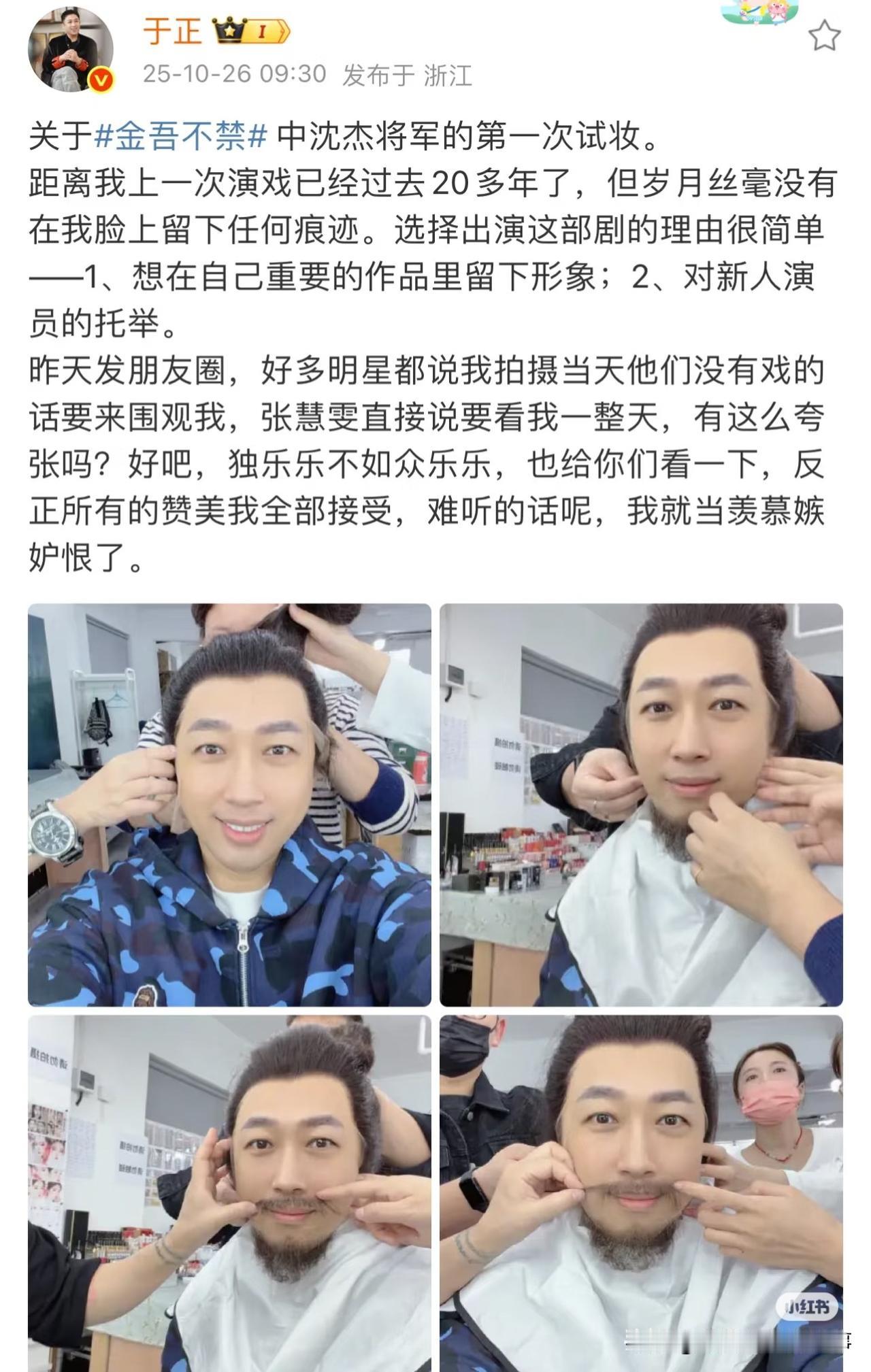 于正这波操作真的离谱又好笑,为了自家赵晴主演的《金吾不禁》,居然下血本亲自试妆上阵,演起了“威武勇猛”的大将军! 谁看了不说一句“于正,威武勇猛”?他倒是过足了戏瘾,爽得飞起,可观众直接看自闭了——想象一下,原本期待的英姿飒爽大将军,变成了于正亲自出演,这画面感来得猝不及防! 不知道赵晴看着自家老板为自己“保驾护航”,是该感动还是该哭笑不得? 你们觉得于正这波亲自下场,是给剧加buff还是减分?