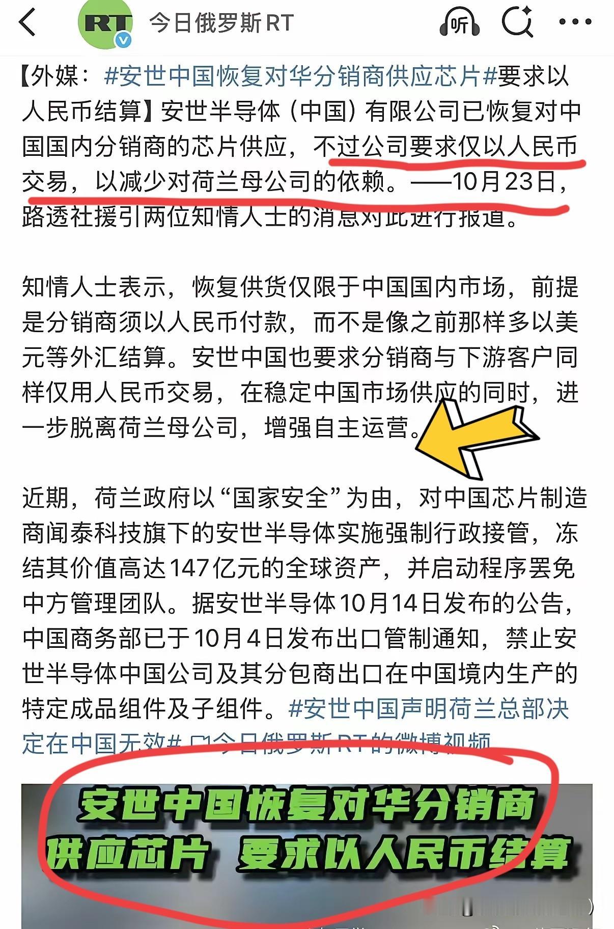安世中国这波操作太绝了!10月23日,安世中国发出通知,所有订单必须用人民币结算。 这可不是简单的生意经,背后是一场大博弈。荷兰政府想靠“接管”安世半导体掌控大局,没想到中国直接切断产能,让其计划落空。安世中国用人民币结算,不仅规避了金融风险,还形成独立的金融闭环。 优先供应国内,虽说可能出货量和速度有变化,但能保障国内供应链稳定。这一招让全球客户不得不适应人民币结算新常态。未来是不是会有更多企业跟进这种模式?我们拭目以待。