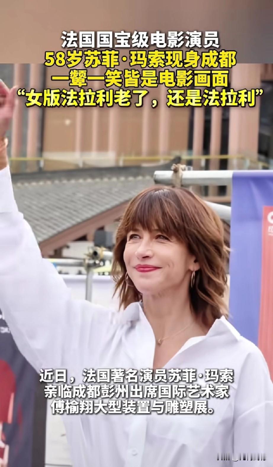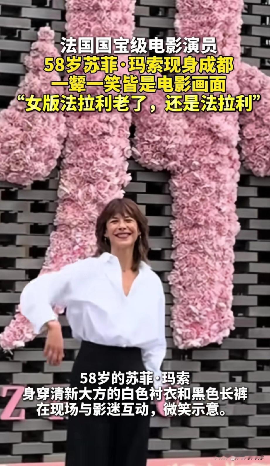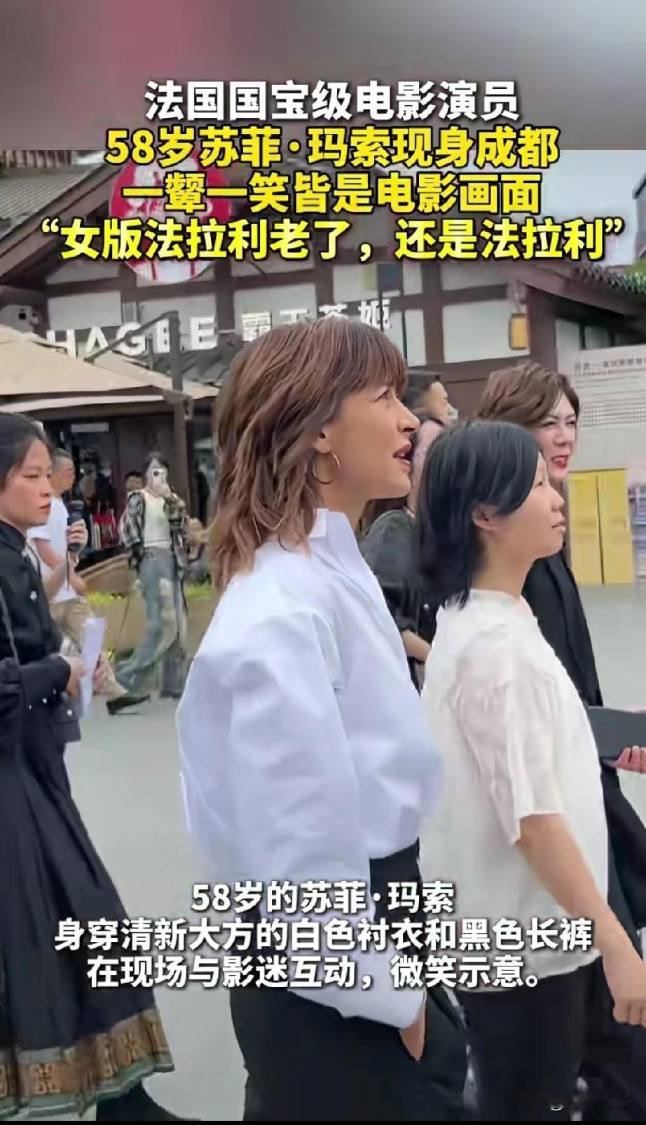 法国国宝级电影演员来到了成都,这个人就是苏菲玛索,1966年出生的她,今年已经59岁了,年轻的时候长得很漂亮,演技也非常的厉害,曾经看过她演的电影,弹指一挥间,她也老喽,尽管穿着打扮很清新,但毕竟也是快60岁的人了,希望她在成都玩的开心!
