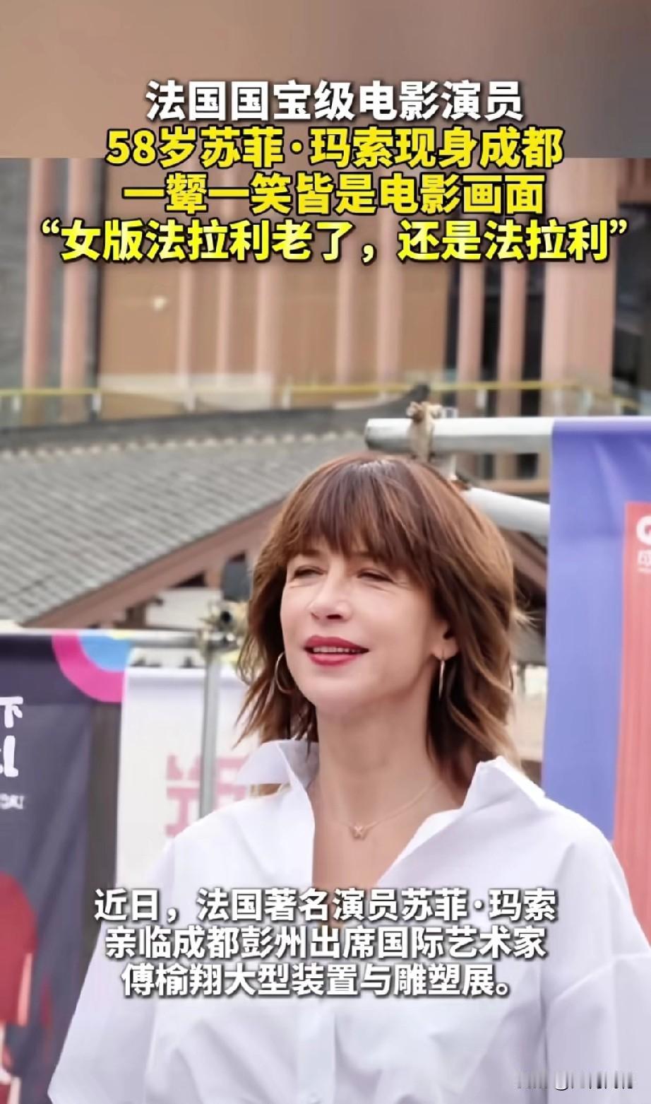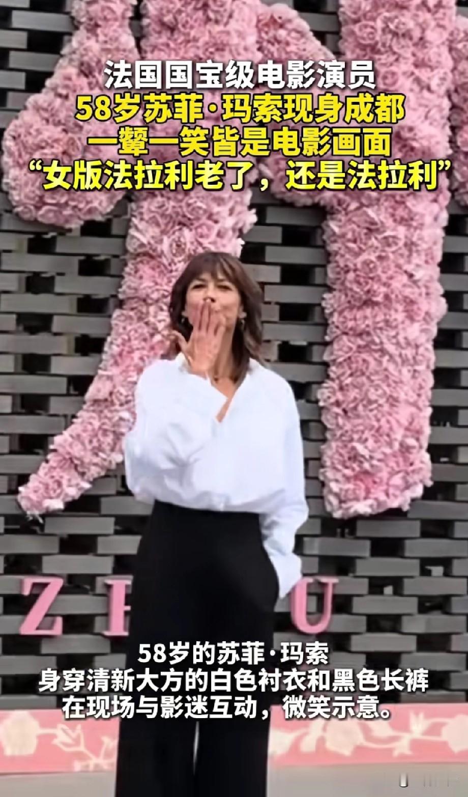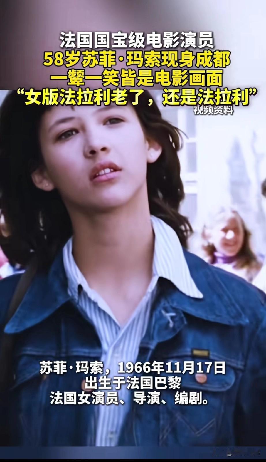 法国国宝级电影演员来到了成都,这个人就是苏菲玛索,1966年出生的她,今年已经59岁了,年轻的时候长得很漂亮,演技也非常的厉害,曾经看过她演的电影,弹指一挥间,她也老喽,尽管穿着打扮很清新,但毕竟也是快60岁的人了,希望她在成都玩的开心!