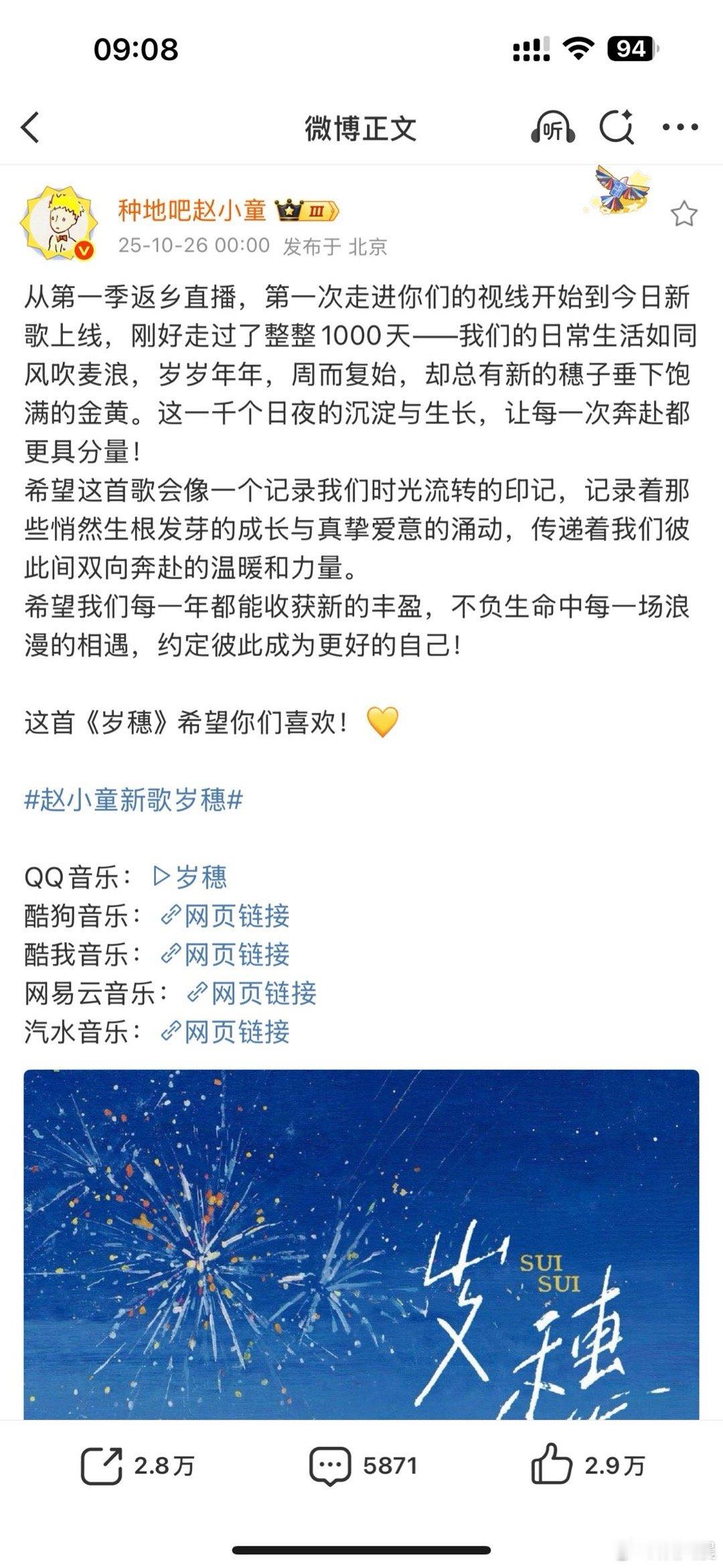 赵小童新歌岁穗 刷到发歌日是返乡直播1000天,突然就被打动了。赵小童真的把对土地的热爱藏进了《岁穗》里,歌声里满是细碎又珍贵的日常,听完心里暖暖的。