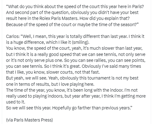 记者:“你觉得今年巴黎的球场速度怎么样?问题的第二部分是,显然你在巴黎大师赛上没有取得最好的成绩。你怎么解释这一点?是因为球场的速度,或者可能是因为赛季的时间?”