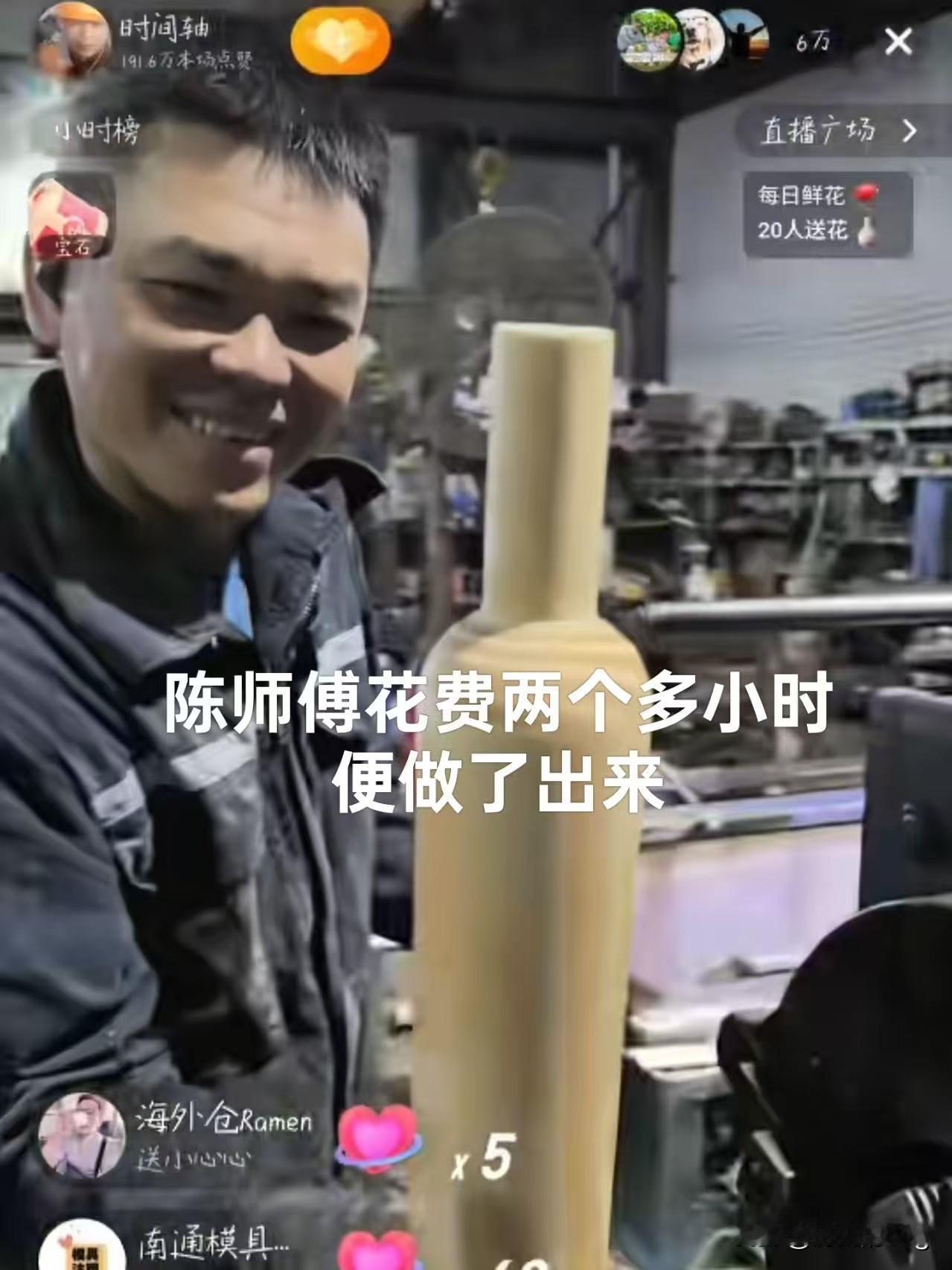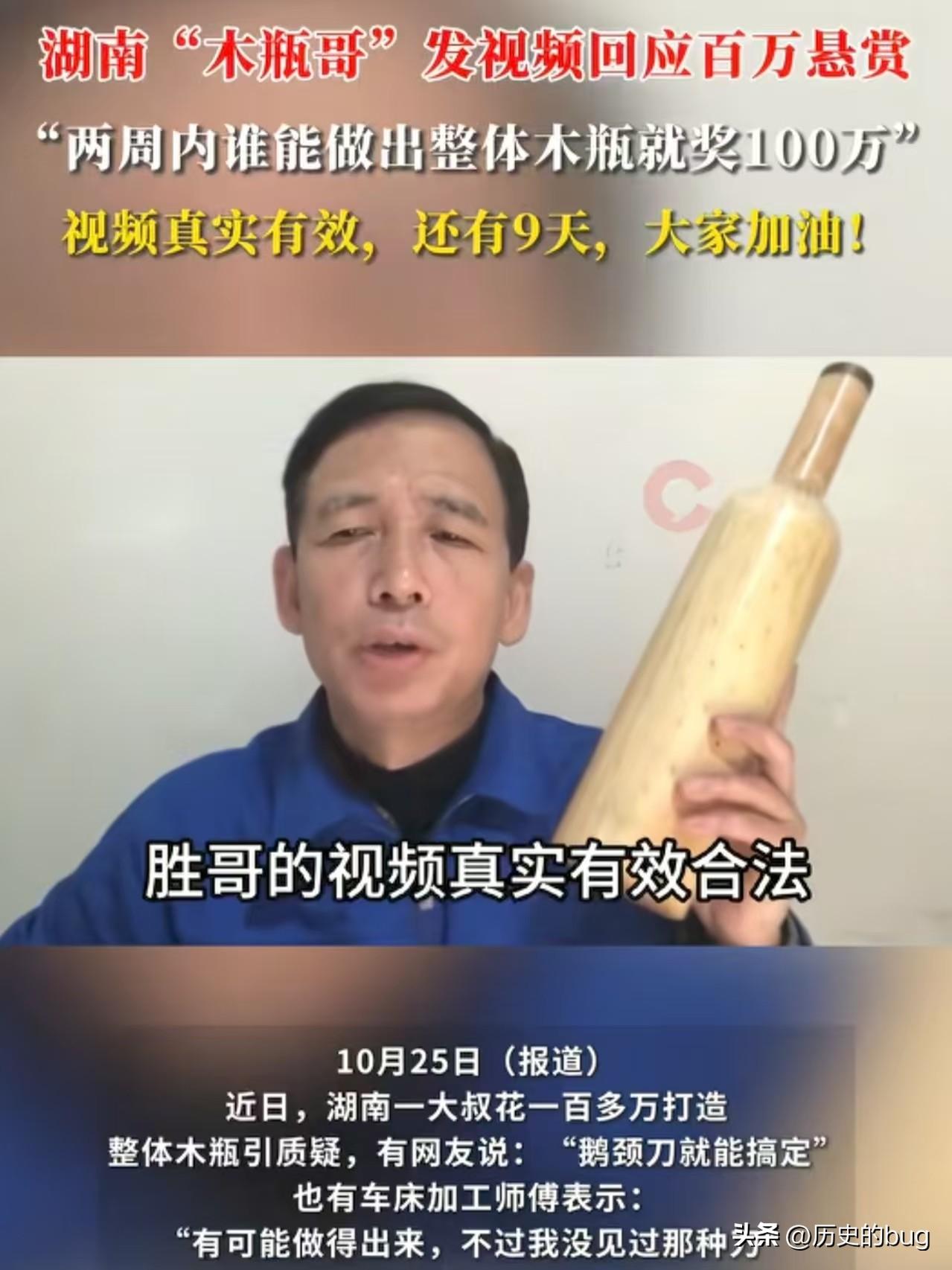 木瓶制作挑战的视频已经被删除,木瓶哥以为的不可复制、没人能够做出来的“整体木瓶”,被广西的陈师傅仅仅花费6个小时便做了出来,还是现场直播,数万人现场观看。 据了解,木瓶哥名叫刘文胜,大家称他胜哥,曾花费3年多的时间雕刻出了一个木瓶,自认为除了他自己,没有人能够再做出来这样的整体木瓶。为了展示自己的独一无二,他发视频全网寻找能够做出来这种木瓶的师傅,如果有人能在两周内做出来这种瓶子,就给予对方100万元的奖励。 广西的陈师傅听说了这件事之后,心里不服气,觉得木瓶哥过于目中无人,于是便决定亲自去试一试。第一次尝试,用了6个小时便做了出来,但是有一点遗憾的是,木瓶的内壁没有打磨好,有部分过于粗糙。于是陈师傅又进行了第二次尝试,这次仅仅用了2个多小时便做了出来,其中有一部分时间还是用来找合适的木头。 在木瓶哥面前难如登天的操作,对于陈师傅来说,2个小时便轻松搞定,其实做这个瓶子不难,难的是找一块适合做瓶子的木头。 目前木瓶哥已经将之前发布的悬赏视频偷偷删除,有网友提出木瓶哥说话不算话,现在人家2个小时做出来了,你倒是出来兑现承诺啊! 有网友评论:“自己在家里研究了一辈子的武林秘籍,出来后发现竟然和广播体操一样简单”!告诫胜哥时刻牢记一句话:人外有人,天外有天,切勿坐井观天,洞中窥月。 最后不得不说,咱们民间的牛人、大神是真的多啊!手工瓶 木瓶挑战