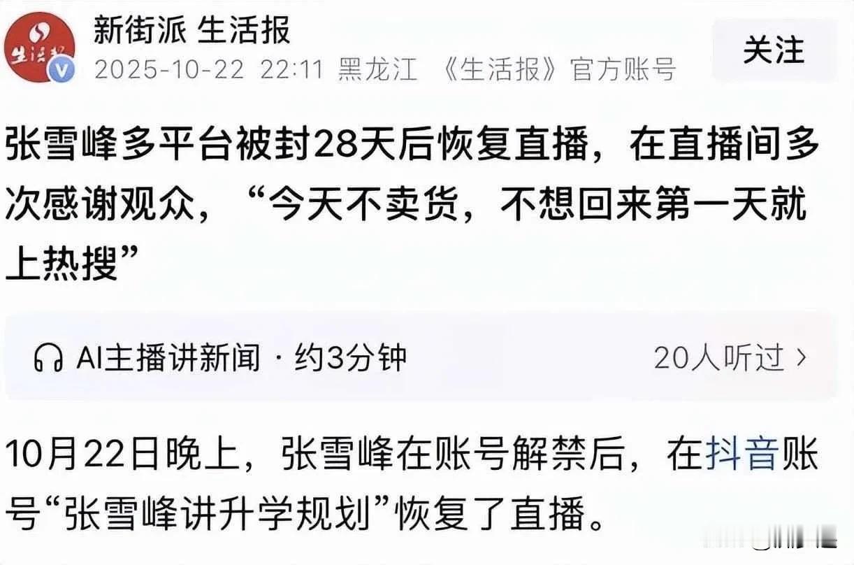 张雪峰复播了,话术变了,焦虑没走 他回来了,直播间里四万人盯着,书卖得比谁都快,他说不卖货,就连麦,可小黄车就搁在桌角,谁都能瞧见,以前骂文科生是舔,现在说大有可为,不是他想通了,是平台管得紧了,风向变了。 官方在清朗行动,直播行业被盯上了,他改口是因为再喊打晕报新闻怕直接被封,这不是教育观点变了,是活命的法子换了,嘴上说不卖课,实际留了个缝,家长问了,我就讲讲哪些能帮上忙,这话听着是帮忙,实则是在引人下单,老招使不动了,他就换新路子,先立个好人设,再偷偷带货。 有人觉得他真改了,其实没改,他以前靠造焦虑拉流量,现在靠消焦虑留粉丝,从说文科没出路变成说文科也能行,看着是温和了,可还是在卖办法,你买他的课、听他的建议,家长就觉得心里稳了,可这稳,是花钱买来的,不是真改了带来的。 有个大学教授最近火了,他讲三个小时,不讲怎么解决,光说现实有多难,经济不好,工作难找,中产撑不下去,听完的人情绪崩了,可没人告诉他们下一步该咋办,张雪峰不一样,他给答案,报班,买课,找他咨询,答案可能是假的,但至少让人觉得还有路可走,一个扔情绪炸弹,一个卖安慰剂,俩人都靠卖焦虑活着。 二十年前有人讲,一句真话比全世界都重,现在真话不为解决问题,就为吓人,张雪峰以前说真话,是想让家长慌,好掏钱,现在他说假话,是想让家长安心,接着掏钱,真话假话都不重要,关键得留住流量。 AI志愿工具早就普及了,六成家长都在用,可他们还是信网红,不是不会查数据,就是懒得查,去年有个家庭,自己花了十五天翻三年的录取线,孩子稳稳上了,另一个家庭,全听张雪峰说,结果滑档,只能复读,责任推给别人,心里舒服,可赔上的,是孩子的未来。 大家总觉得敢说真话的就是好人,可真话得看怎么用,汉斯·罗斯林说过,人容易被情绪牵着走,短视频最懂这个,专挑你最怕的那点戳,张雪峰踩得准,他知道家长最怕孩子没出路,最怕自己没尽到心,于是他给出办法,哪怕这办法就是个买卖。 网上天天吵怎么搞垮特朗普,怎么拿下台湾,可现实中,成千上万的家庭还在凌晨三点翻志愿填报的攻略,大事情闹得欢,小日子过得苦,没人替他们扛着,他们就找专家来顶雷,买课,买建议,买个心里踏实,清醒的人不多,因为清醒就得吃苦。 他没消失,就是换了个法子,以前是冲在前头喊快跑,现在是站在后头说别急,家长也没醒,从吓着了变成被哄着,焦虑还在,只是裹了层软乎乎的皮,直播间里他笑呵呵说文科也有路,屏幕外头家长悄悄点开了购物车。张雪峰