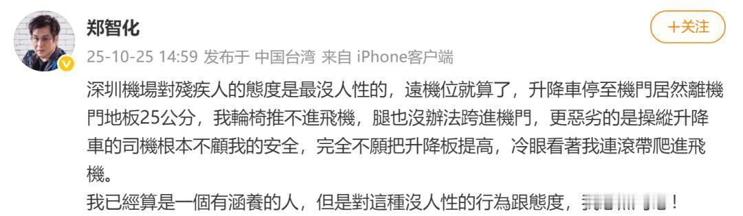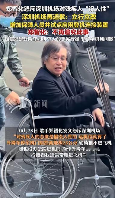 郑智化回应深圳机场致歉:不再追究深圳机场回应郑智化连滚带爬进飞机头号创作者激励计划郑智化也是见好就收,看到深圳机场给自己道歉并整改,立即公开发文说明不再追究。郑智化及其团队是非常懂得境内舆论场的,因为现在很多网民支持他并谴责深圳机场,可随着事情的发展,后面就可能会有网民指责他耍特权,甚至从某种高度上攻击他污蔑国内;如果这股情绪起来,他未来再想来内地发展就难了,毕竟他的台湾省居民身份在一些网民眼里和内地人还不一样。但从理性和实际上来说,不管郑智化是哪里人,深圳机场的如此行为也要受到批评,对残疾人员的特殊照顾是公认的文明标志,也是对服务行业的基本要求。