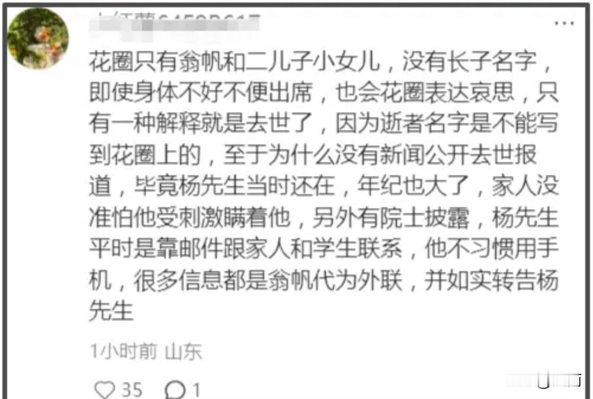 “令人唏嘘”!葬礼上没有出现大儿子的身影,不是忙于工作,也不是身体不好,而是他早于父亲先走了。 从一些细节也能说明这种说法不是空穴来风。葬礼上花圈挽联上的署名只有翁帆和先生的小儿子以及女儿的名字。唯一的解释就是逝者的名字,是不能再写到花圈挽联上的。 而早在今年2月份的时候,外媒新闻的一则讣告给出了去世原因。他是因为意外去世的,终年73岁。 之所以没有公开这个消息,当时也是顾及了先生的感受。真是让人唏嘘。