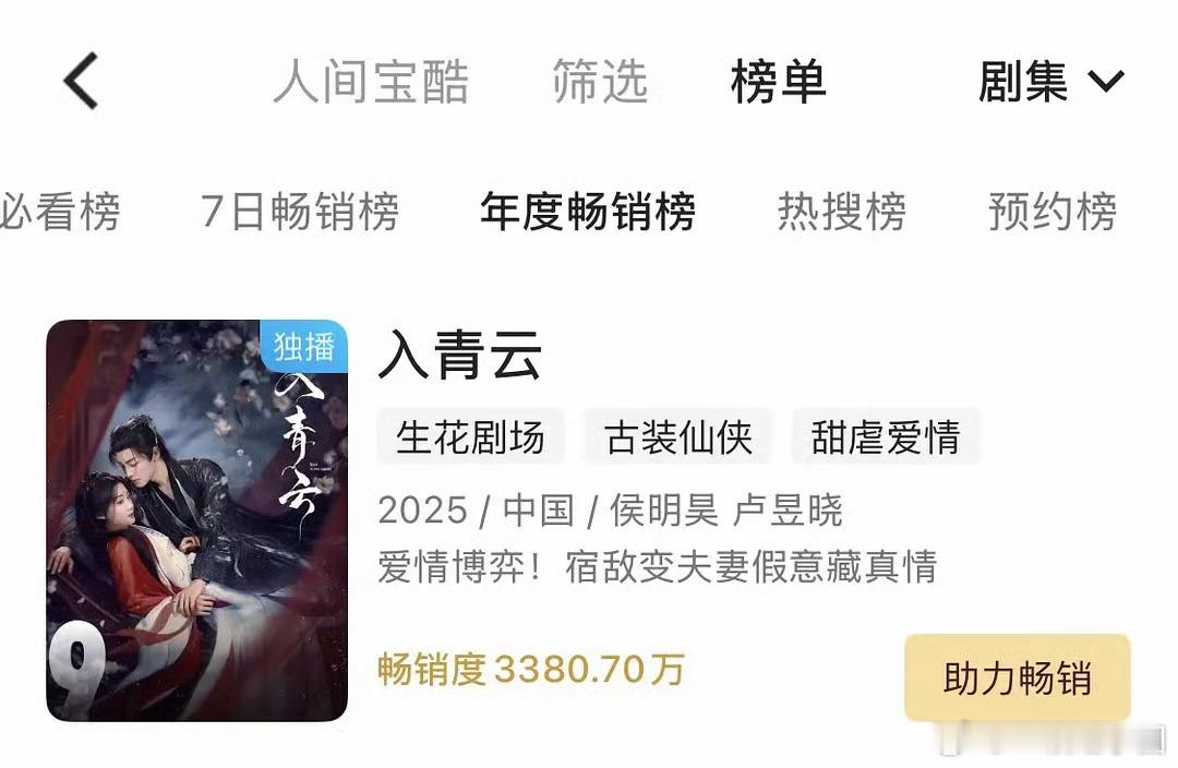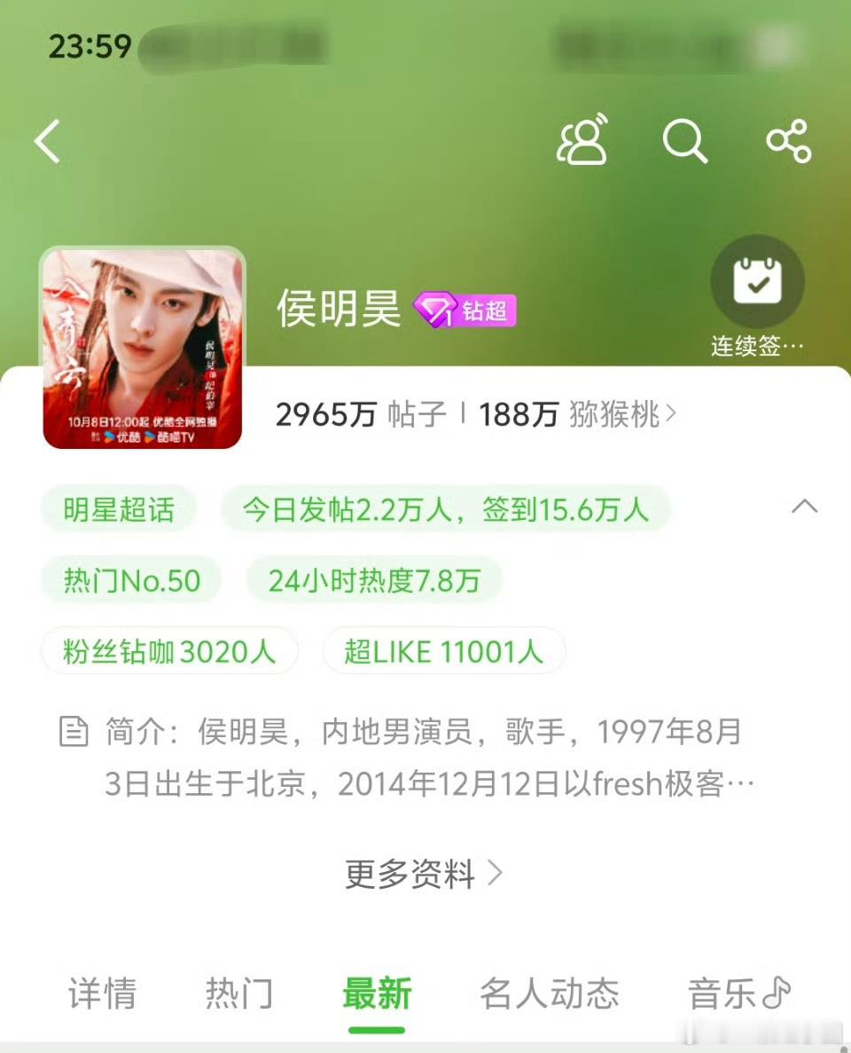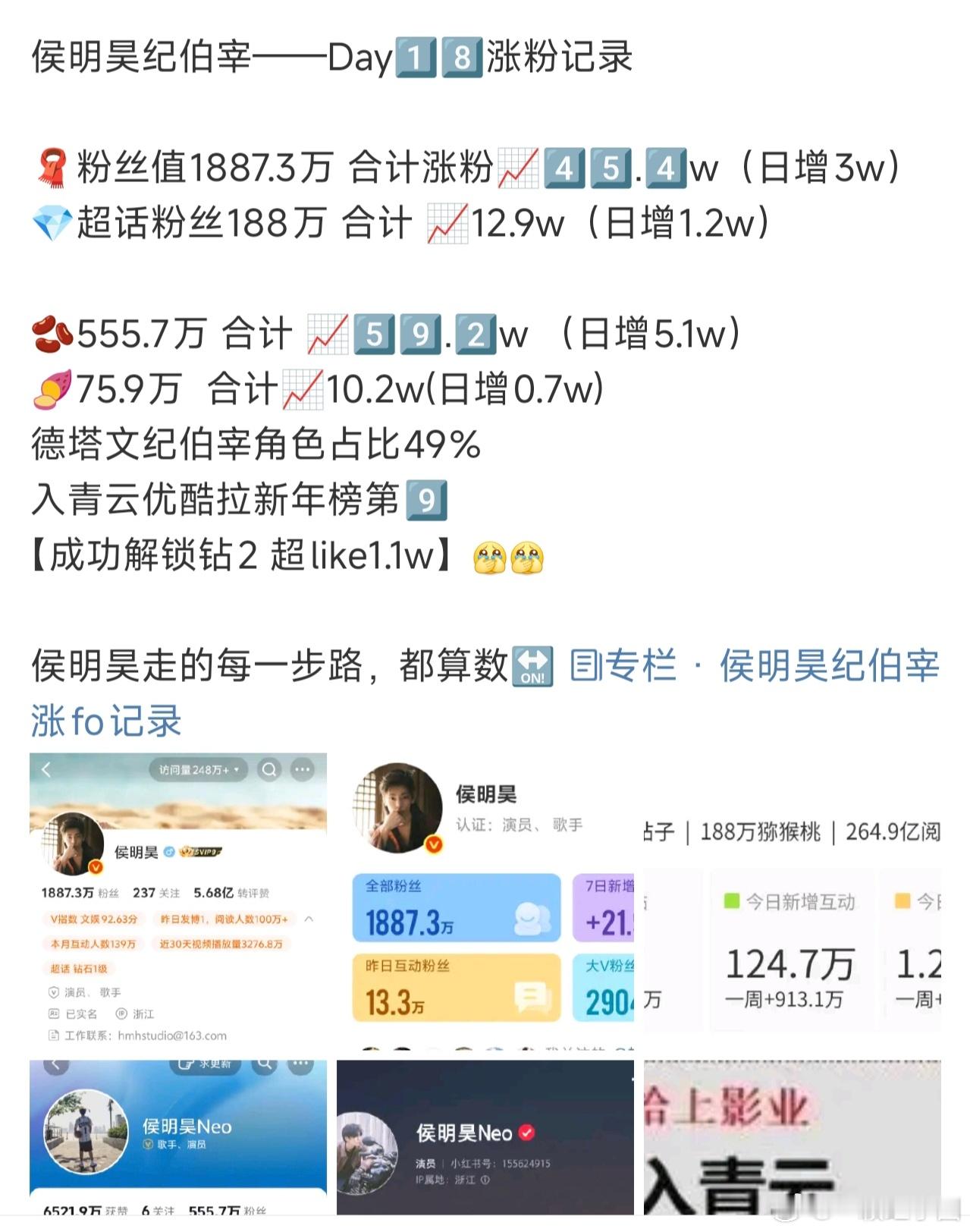 恭喜侯明昊在入青云超点之日,超话解锁💎二!发帖超like也新高!同时入青云开播第18天进了年榜第九!全平台到目前为止,涨粉共计130万,真的有效剧播,不愧为手握三部一番破万95生[赞][赞]