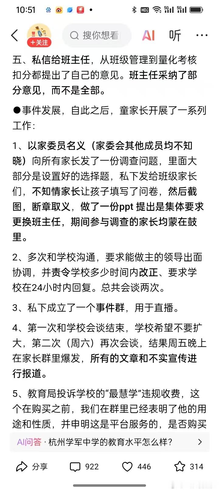 刚到学军紫金港高中高一,家长就跟学校闹起来,一是孩子选班长没选上;二是家长建议“搞军训视频活动、家委会怎么开会”,班主任没听,有点在指导老师如何工作了味道,加上家长误会了“最慧学”平台要收费,矛盾就爆发了。