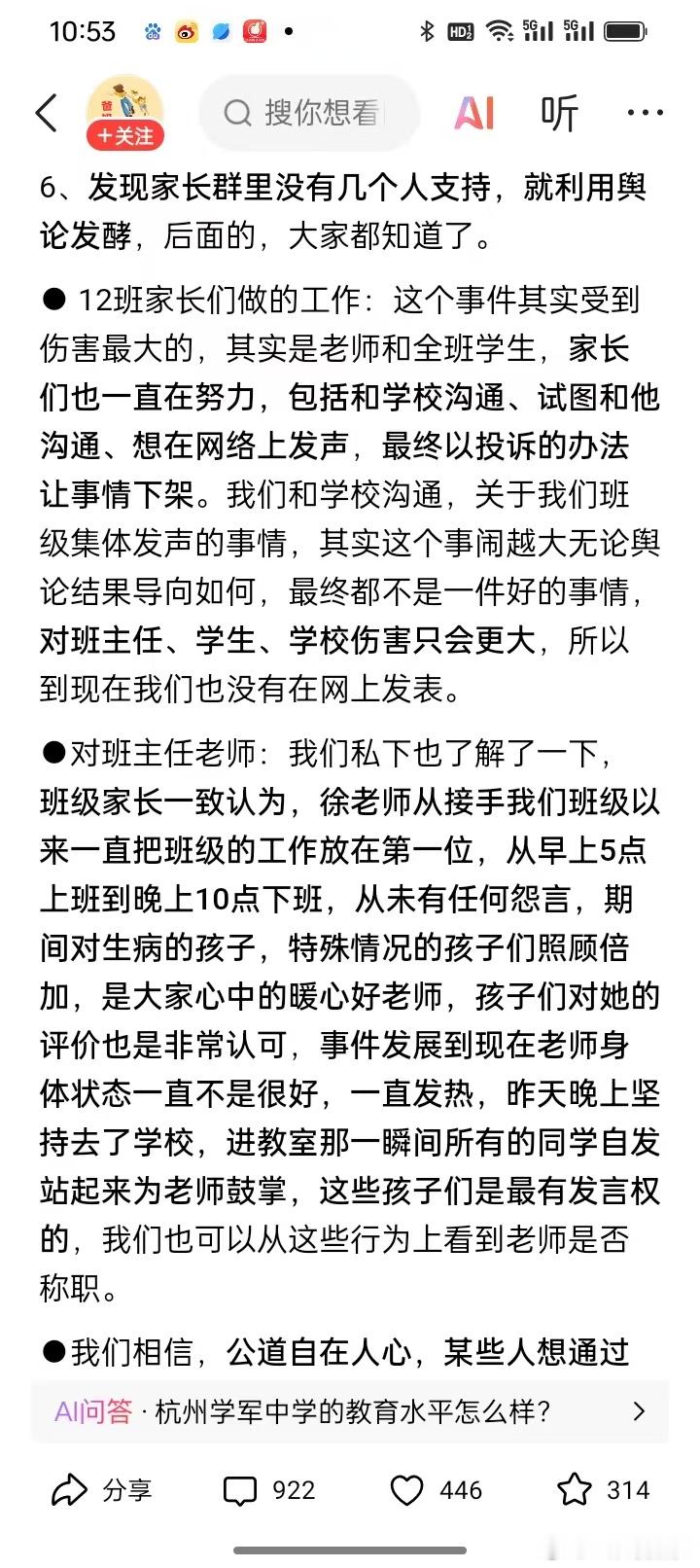 现在学校说,大部分家长和学生都支持班主任,这位班主任每天从早忙到晚,对学生也上心,学生还曾主动给他鼓掌。但这事已经影响到班主任和班里的正常教学了,两边还得接着沟通。