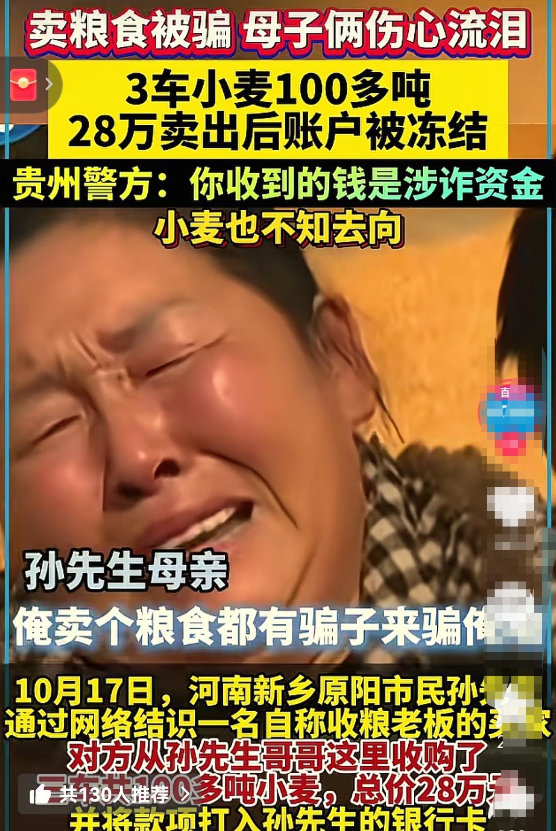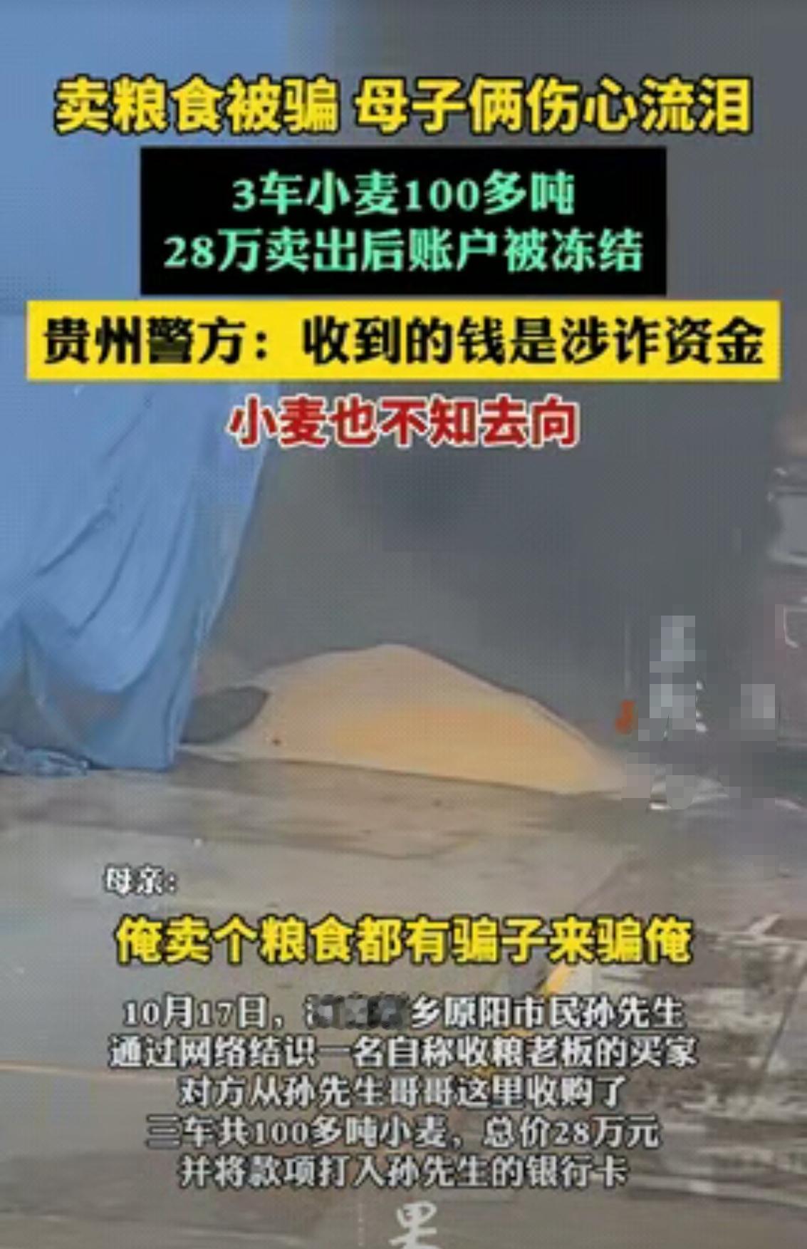 28万卖粮款竟是诈骗资金!河南母子三车小麦“不翼而飞”,银行卡被冻结 河南新乡,一对母子辛辛苦苦收获的100多吨小麦,装满了整整三辆大货车,卖了28万元。当看到钱款到账的短信时,一家人喜上眉梢,种地的辛苦在这一刻觉得都值得了。谁知喜悦如此短暂,没过多久,他们却发现银行卡突然被冻结了——那28万元卖粮款,竟然是涉诈资金! 这对老实巴交的母子怎么也没想到,自己在网上联系的“收粮老板”竟是个骗子。对方为了伪装成正常生意人,不仅专门派来三辆货车拉粮食,还特意安排了专人现场监装,一切看起来都那么正规。可粮食运走后,买家和三车小麦就如同人间蒸发,再也联系不上了。 “我们种地不容易啊......”面对镜头,母子俩伤心流泪,这些钱是他们起早贪黑、面朝黄土背朝天的血汗钱,如今却可能血本无归。 被骗后,母子俩找到了当时监装粮食的人,可对方也是一头雾水,表示自己只负责监督装车,对其他事情完全不知情。 警方调查后揭开了真相,原来这是骗子精心设计的洗钱骗局。诈骗分子将骗来的钱伪装成正常交易款项,通过购买粮食的方式进行洗白,而这对母子不幸成为了他们的“洗钱工具”。 这种新型骗术让人防不胜防。骗子不再直接骗走卖家的货物,而是用来历不明的钱款支付货款,等到资金被查明冻结,货物却早已被转移销赃。卖家最终落得“钱货两空”的结局。 更令人愤慨的是,骗子专门挑选信息相对闭塞、防范意识较弱的农民下手。他们利用农民的朴实和信任,以看似正规的交易流程骗取信任,得手后便消失得无影无踪。 此案也给所有人敲响了警钟:大额交易务必提高警惕!尤其是通过网络联系的陌生买家,更要谨慎对待。最好的防范方式是坚持当面交易,核实对方身份信息。骗子往往不敢以真面目示人,总会找各种理由回避见面。 目前,警方正在全力追查资金和小麦的去向。但对这对母子来说,这段被骗的经历已经给他们留下了深深的创伤。一年的辛勤劳作,可能就这样付诸东流。 害人之心不可有,防人之心不可无。希望这样的悲剧不再重演,希望每一位辛勤劳作的农民都能安安心心收获自己的劳动成果!