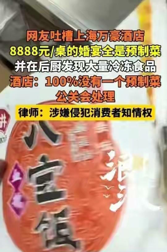 上海天价婚宴“预制菜”风波升级:罗永浩发声、官方介入 结婚本是人生大事,上海一对新人却在婚宴上遭遇糟心插曲——他们花费近40万元(每桌8888元)在某酒店办婚礼,宾客们还没下桌就满是抱怨:菜不仅没热气、缺现做的锅气,部分菜品甚至带着冰渣,根本没法吃。 宴席期间,问题接连暴露:20多道菜里没一道是热乎的,流沙包表面看似冒热气,咬开内部却是冰凉的;白切鸡解冻不彻底,不仅带着冰渣,盘底还渗出血水;清蒸鱼不仅有冰渣,味道也十分怪异。宾客们猜测,这些菜大概率是预制菜,新人听后又气又委屈,当场找酒店负责人对质。 可酒店方坚决否认,声称“100%没有一道预制菜”,还要求新人立即删除相关视频和网上负面评论,并向酒店道歉,否则就要通过法律程序维护声誉。不甘心的新人坚持要去后厨查看,尽管酒店百般阻拦,最终还是没能拦住。 进入后厨后,新人更是傻了眼:这里看不到任何现炒的痕迹,没有明火灶,只剩一堆拆开的塑料包装袋;海鲜只有空贝壳不见肉,就连最基础的八宝饭都是提前预制好的,卫生条件也令人堪忧。“我们花8888元一桌,就吃这种东西?”面对新人的质问,酒店依旧拒不承认使用预制菜。 事后,新人心头的火气难消——这个价位在上海能找到不少高档次酒店,自己显然是被坑了。于是他们将此事发到网上,很快引发全网热议。有网友质疑,涉事酒店作为全国连锁品牌,竟会出现这种问题;也有网友表示,8888元一桌的婚宴在上海算高档次,出现这种情况实在说不过去。 随着事件发酵,罗永浩也加入讨论,而涉事酒店则紧急关闭了评论区。目前,官方已介入此事,后续进展还需等待进一步消息。