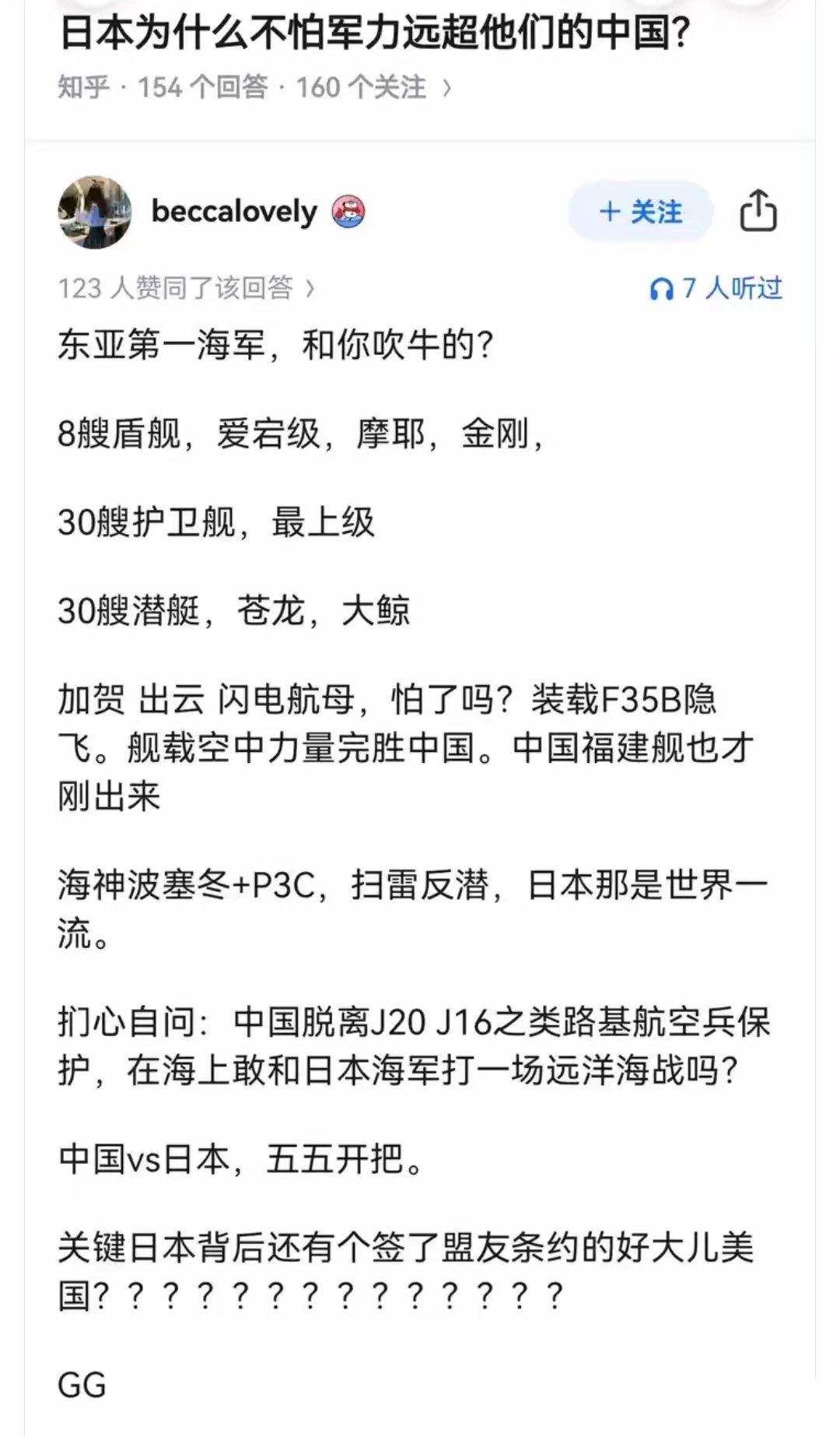 都2025年了,竟然还有人说中国海军干不过日本? 也不知道谁给他的自信,还说日本背后还有个签了盟友条约的好大儿美国。 现在连老美自己都害怕我们,之前055敢硬刚美国航母,就是很好的证明。 就日本目前海上自卫队这些装备,交给055对付就够了。 这些跪族不是傻,就是纯纯的坏。 到时候结局和他的相反,他又会说是他忽悠的。