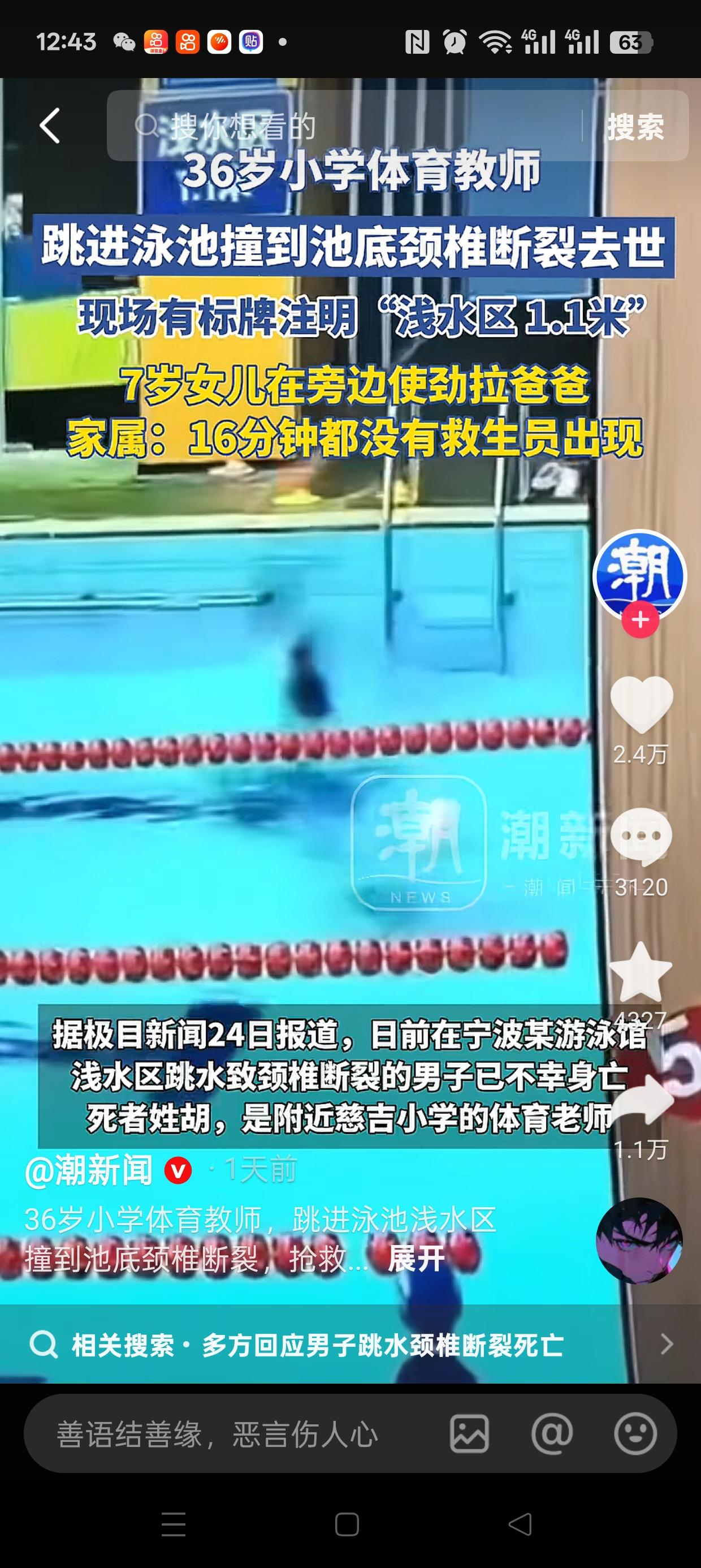 36岁体育老师浅水区一跳,永远告别7岁女儿!这个致命错误很多人都在犯 7岁的小女孩用力拉扯着父亲的手臂,水池泛着涟漪,可爸爸再也不会回应了——这个画面,成了他们最后的告别。 上周六下午,某游泳馆发生令人心碎的悲剧。一名36岁的体育老师在仅1.2米深的浅水区纵身跳水,头部猛烈撞击池底,导致颈椎粉碎性断裂。在场游客回忆,他7岁的女儿试图将父亲拉出水面,却无力回天。 令人揪心的是,小女孩既没有哭喊也没有呼救,只是机械地重复着拉扯动作。心理专家分析,这极可能是突发创伤导致的"情感冻结"——孩子在巨大惊吓中失去了正常反应能力。 更值得我们深思的是:作为一名受过专业训练的体育老师,他本该最清楚安全规范。浅水区禁止跳水的基本常识,为何会被忽视?这起悲剧暴露出一个普遍现象:成年人往往因过度自信,将安全警示抛诸脑后。 生命没有重来的机会。这场本可避免的悲剧,不仅让一个家庭支离破碎,更警示我们:再熟悉的环境也要保持敬畏,再微小的风险也要认真对待。毕竟,家人期盼的,永远是你平安归来。