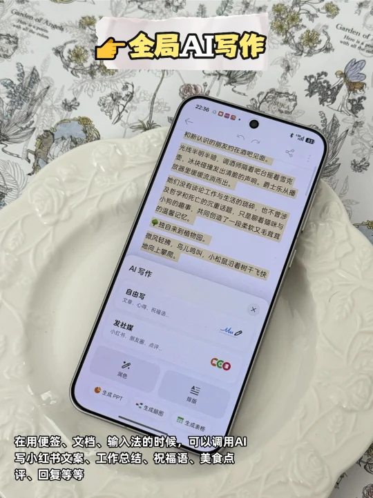 用便签、文档、输入法的时候,可以调用AI写文案、工作总结、祝福语、美食点评等等。还能一句话生成PPT,帮职场人、学生党节省时间。