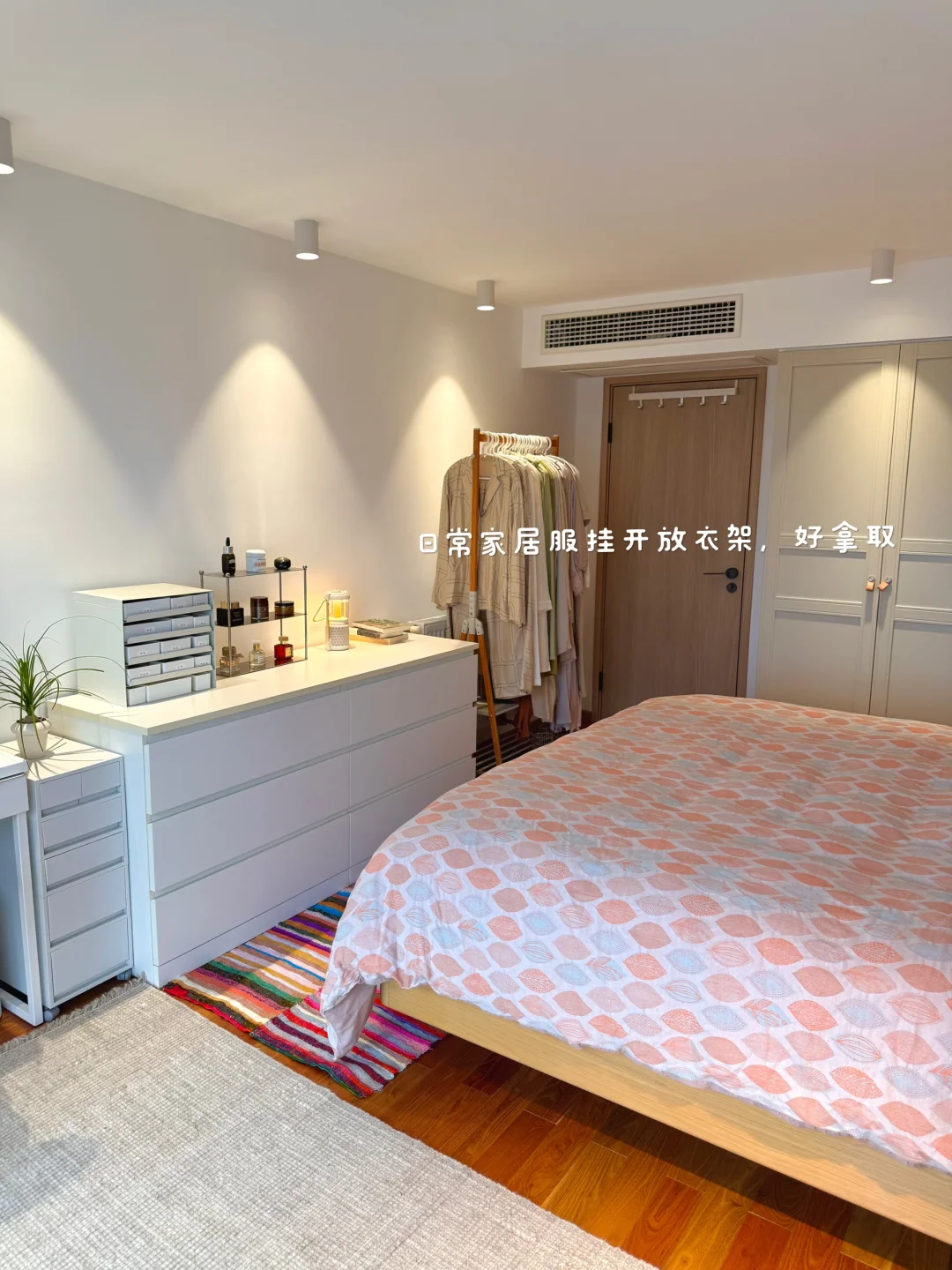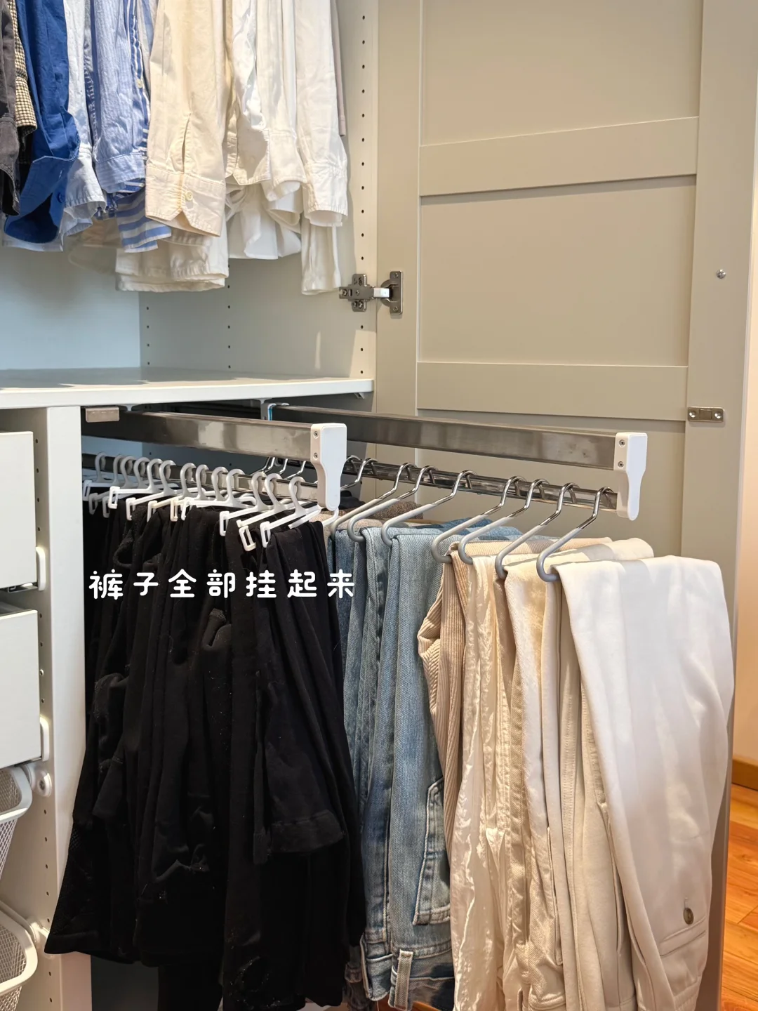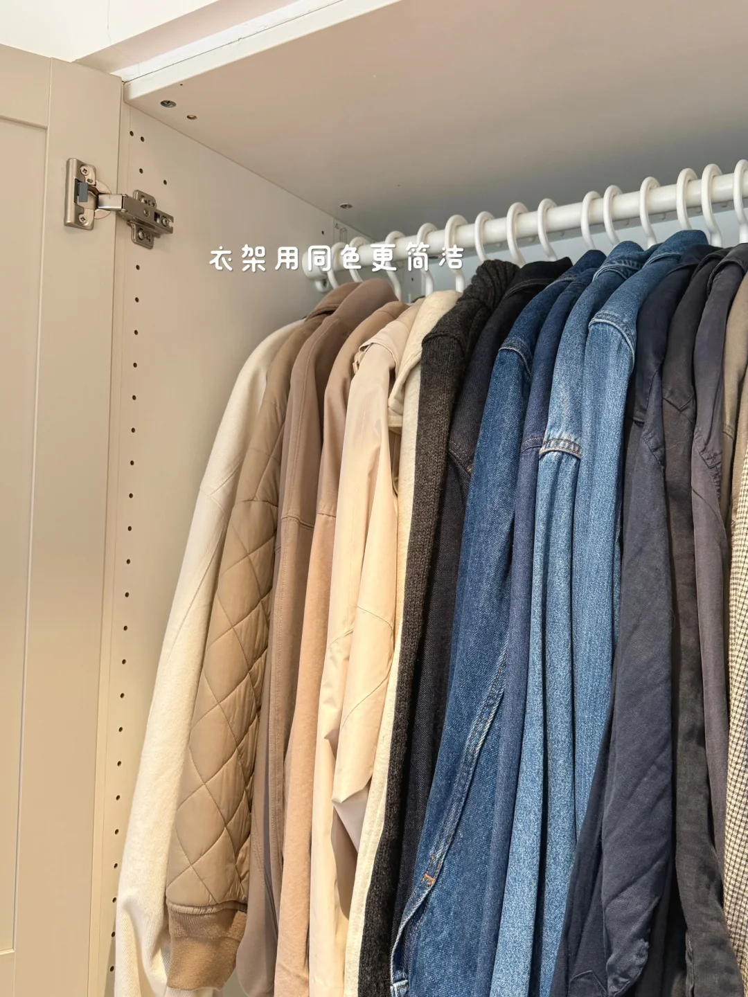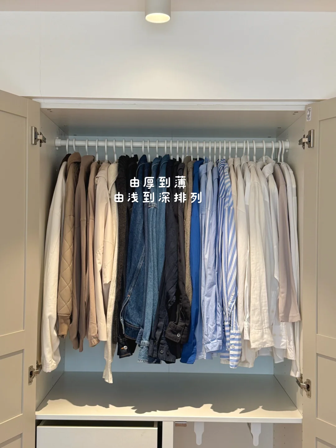 最近换季好好整理了一下衣橱,清理了很多不穿的衣服!整个秋季一个1米的衣柜收纳完全足够了! 关于衣柜、衣架: 衣柜是成品,先装柜子再吊顶,跟定制也就没啥区别了,挺结实! 衣架建议用同款同色看着更简洁!两边有弧度的,不会挂出将军肩 - 关于衣服: 说来惭愧,35岁才明白是衣靠人穿而不是人靠衣装!好好锻炼身体,调整体态!哪怕随便一件T恤也能穿的得体又精神!少买精买,一件衣服至少能跟衣橱里的衣服搭出3到5套才购入,买一出一,永远控制衣服总量,比无节制乱节省了大量的精力,也节省了很多💰 - 关于收纳: 外套,衬衫,裤子全部挂起来。按照从厚到薄,从深到浅的顺序,看起来会非常舒服! 毛衣卷起来再放进抽屉,更省空间,拿出来也不会有折痕 - 关于极简: 每个人对极简的感知不一样。有的人是东西越多越开心,有满足感。有的人是东西多了就很心烦,我属于后者。所以在源头上控制自己少买精买,再定期断舍离,让我非常开心。想到我花重金买的房子,每一平米都能被我充分利用起来,里面没有垃圾,装的都是我的心头爱,就觉得超有成就感!