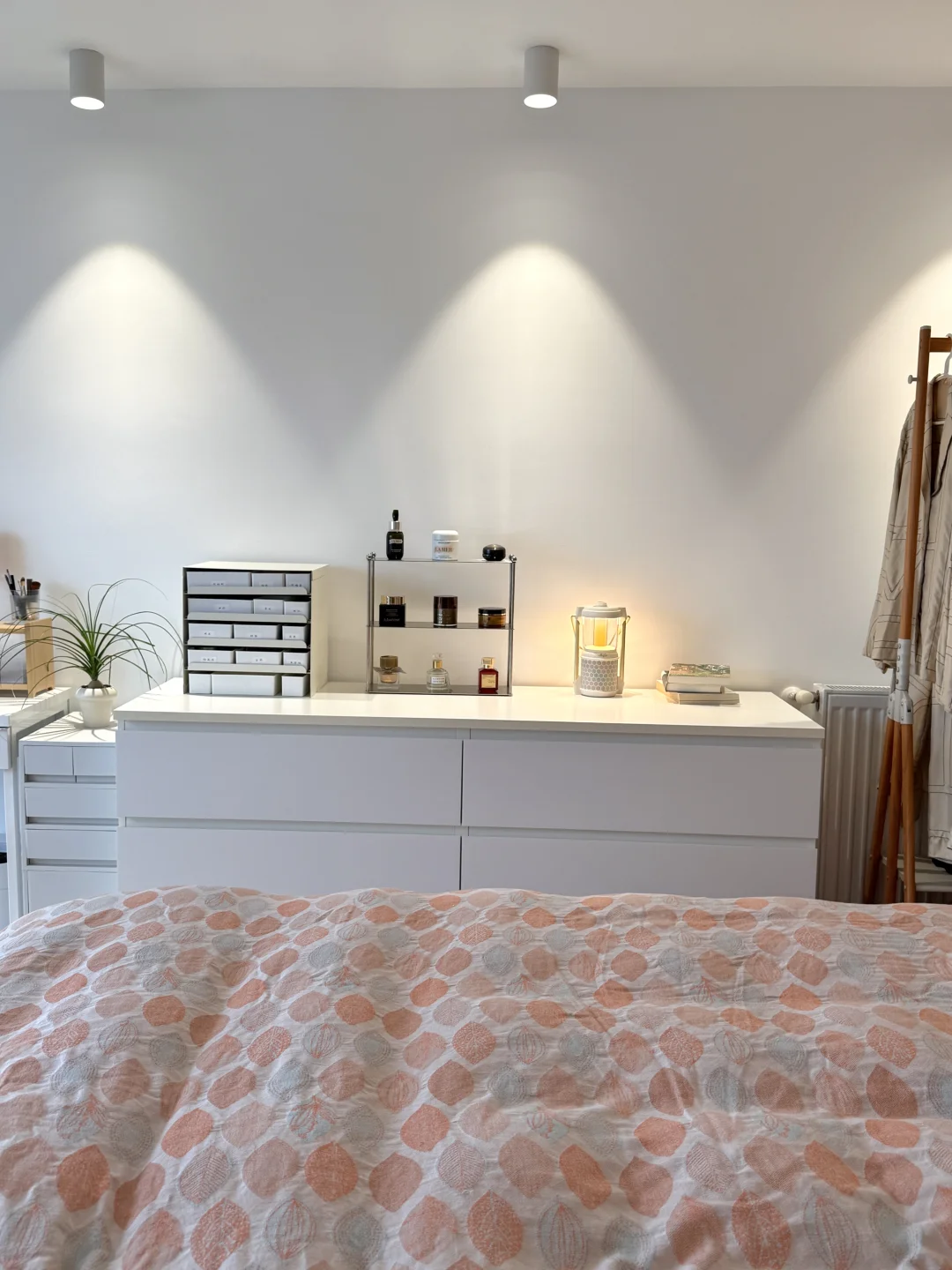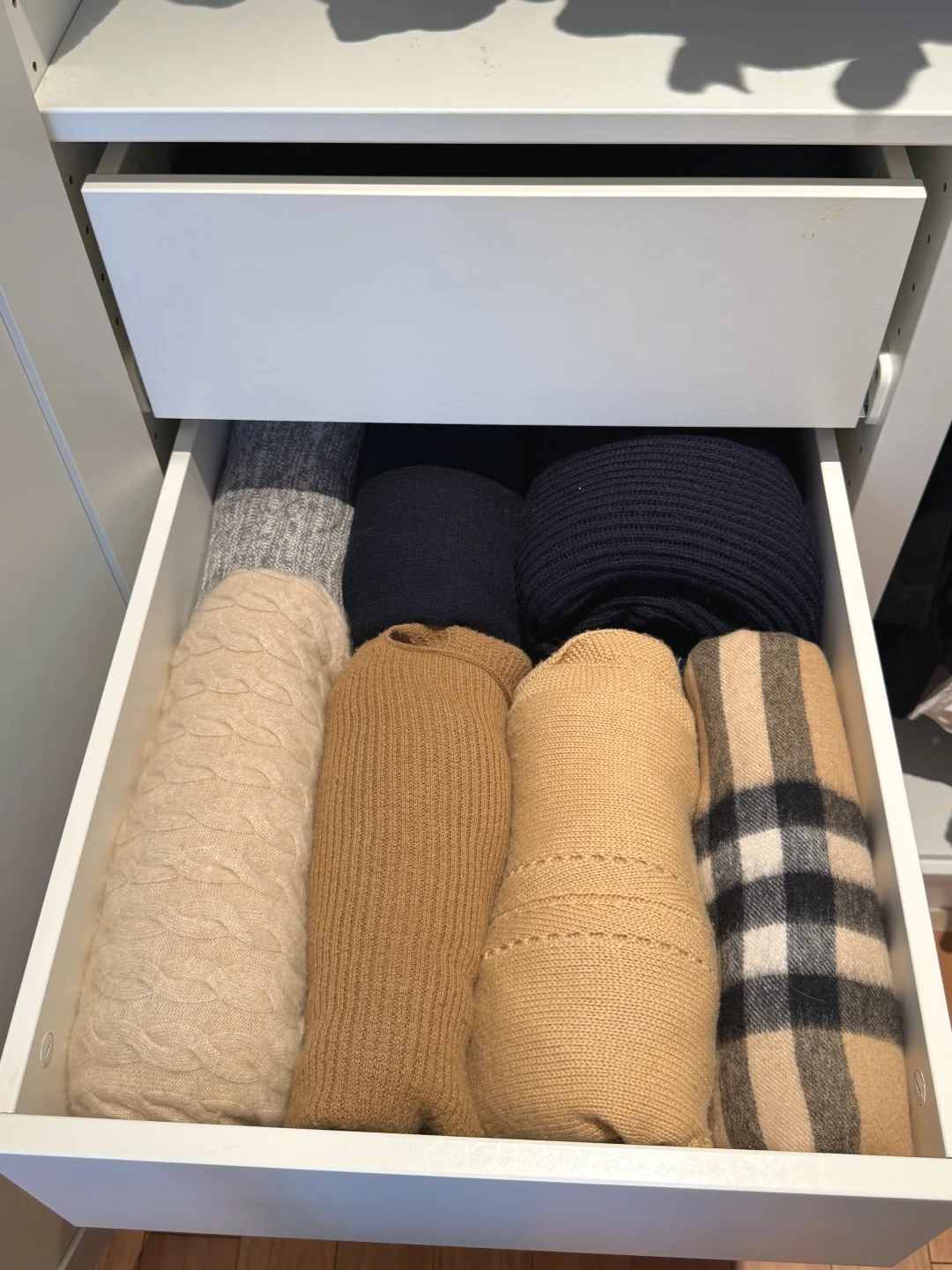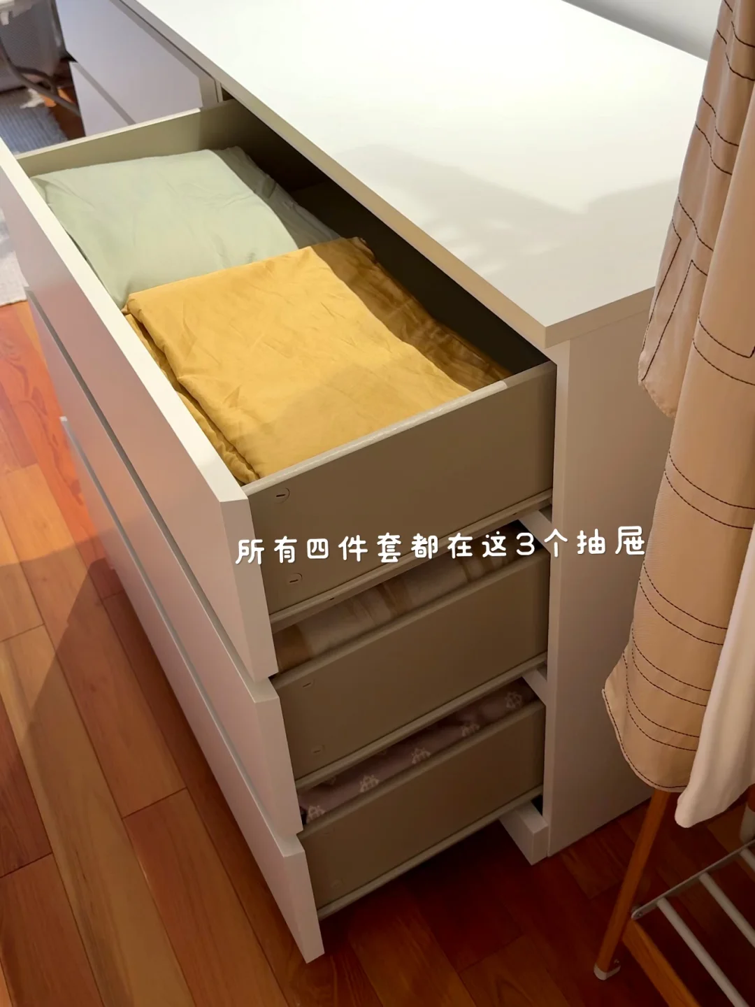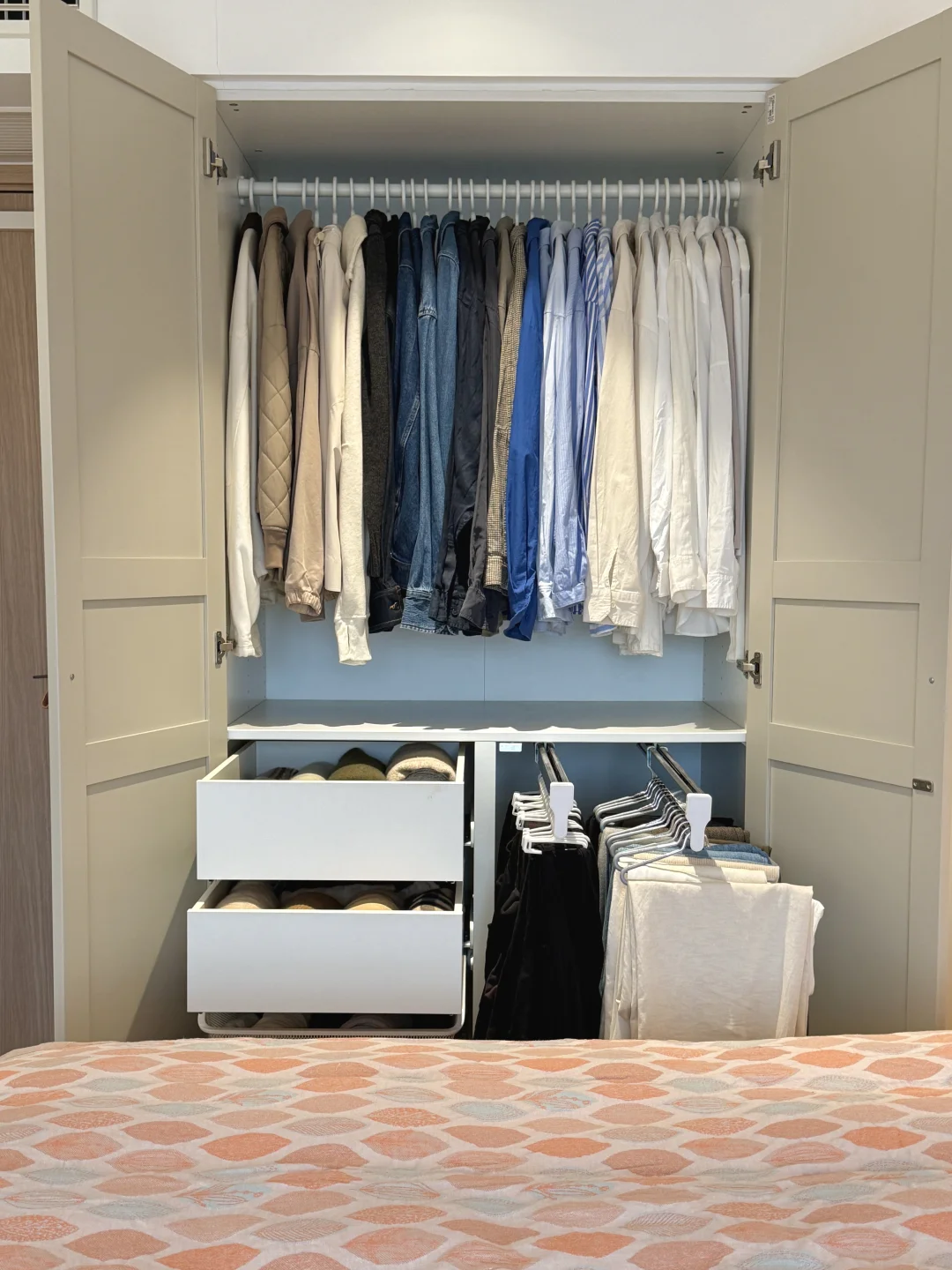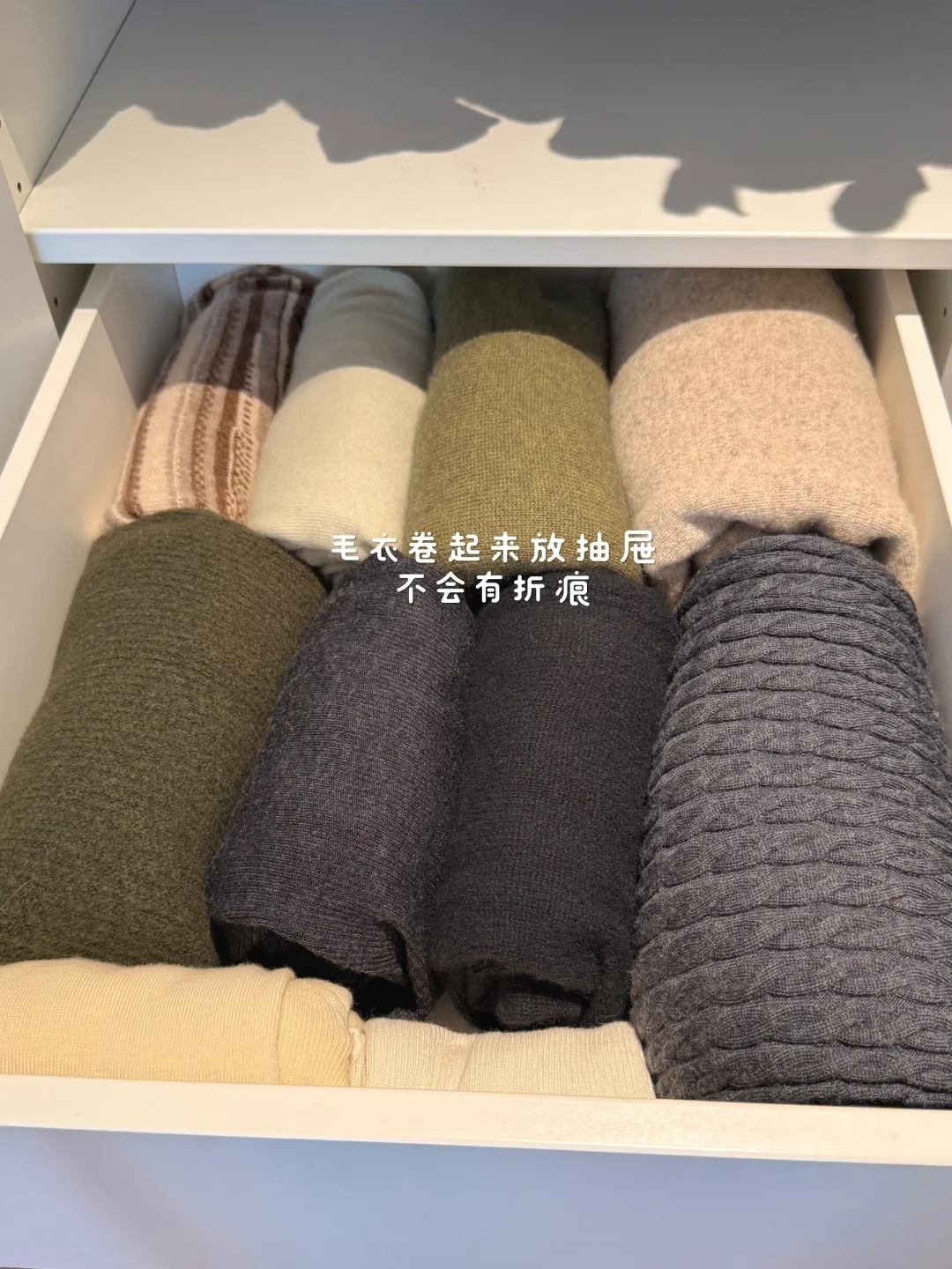 最近换季好好整理了一下衣橱,清理了很多不穿的衣服!整个秋季一个1米的衣柜收纳完全足够了! 关于衣柜、衣架: 衣柜是成品,先装柜子再吊顶,跟定制也就没啥区别了,挺结实! 衣架建议用同款同色看着更简洁!两边有弧度的,不会挂出将军肩 - 关于衣服: 说来惭愧,35岁才明白是衣靠人穿而不是人靠衣装!好好锻炼身体,调整体态!哪怕随便一件T恤也能穿的得体又精神!少买精买,一件衣服至少能跟衣橱里的衣服搭出3到5套才购入,买一出一,永远控制衣服总量,比无节制乱节省了大量的精力,也节省了很多💰 - 关于收纳: 外套,衬衫,裤子全部挂起来。按照从厚到薄,从深到浅的顺序,看起来会非常舒服! 毛衣卷起来再放进抽屉,更省空间,拿出来也不会有折痕 - 关于极简: 每个人对极简的感知不一样。有的人是东西越多越开心,有满足感。有的人是东西多了就很心烦,我属于后者。所以在源头上控制自己少买精买,再定期断舍离,让我非常开心。想到我花重金买的房子,每一平米都能被我充分利用起来,里面没有垃圾,装的都是我的心头爱,就觉得超有成就感!
