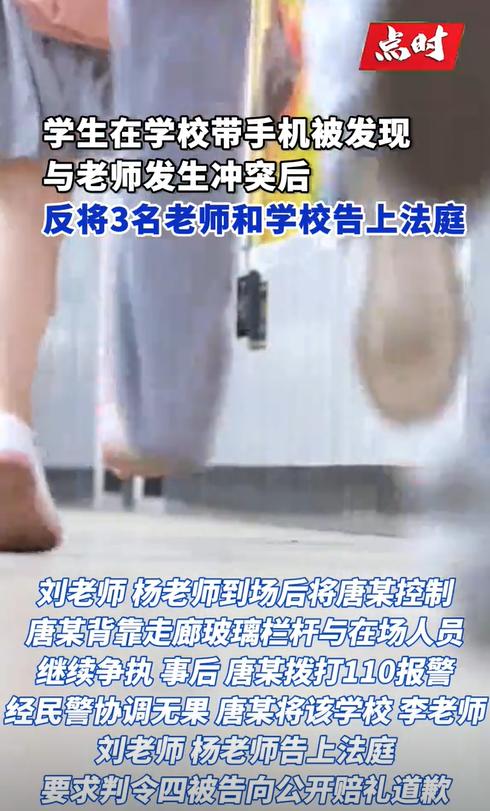 天津,一高中男生违规把手机带到学校,还不慎掉落在一位老师的脚边。老师发现后不许男生捡手机,但男生不听,双方为此发生争执。另外两名老师闻声赶来后,将男生控制在走廊边。谁知男生认为自己身心都受了伤害,先是报了警,后直接将学校和3名涉事老师都告上了法院,要求他们公开赔礼道歉。法院判了!(来源:点时新闻,天津市宝坻区人民法院) 据悉,学生唐某所在的学校是明令禁止学生在校内使用手机的,学校也多次进行了禁止携带手机的宣传,也通知过学生的家长。 事发当天,唐某上完厕所准备回教室,谁知手机突然掉在了学校走廊,还刚好掉在李老师的脚边。 唐某见状立即准备去捡手机,但被李老师给制止了。然而唐某还是强行把手机给捡了起来,不仅如此,在捡起手机后,他还和李老师吵了起来,指责李老师多管闲事。 二人的争吵声引来了刘老师和杨老师,他们看唐某情绪激动、气势汹汹,就上前把唐某给控制住,围在了走廊边进行批评教育。 然而即便面对两位老师,唐某依旧不怂,靠着走廊玻璃栏杆继续和他们争执。 事后,唐某心里越想越气,直接报了警,还一口咬定自己被老师控制住,导致呼吸困难,这不仅伤害了自己的身体,还让自己的自尊心受挫。 民警介入后,并未认定老师的行为违法,只是对此事进行了调解,但一直没有个结果。 唐某不甘心,于是将学校和3位老师都告上了法院,要求他们公开赔礼道歉。 有网友表示:“学生也是人,即便犯错了,老师也不能这么霸道,怎么能随便控制人家的自由。” 还有网友表示:“学校有规定不让带手机,可学生却不听劝阻。既然学生不遵守规定,那老师自然有权批评教育学生了,这有什么错?” 那法院会怎么判? 唐某主张的是要求学校和3位老师赔礼道歉,他认为自己被3位老师限制了人身自由,对他的自尊心造成了伤害。 《未成年人保护法》第27条规定,学校、幼儿园的教职员工应当尊重未成年人人格尊严,不得对未成年人实施体罚、变相体罚或者其他侮辱人格尊严的行为。 唐某认为,这3位老师的行为已经严重侵害了他的人格尊严,且对他实施了体罚,使得他的心灵受到了创伤。 然而法院调查后发现,通过走廊的监控可以看到,唐某所说的基本都是事实,但是3位老师从始至终都没有对唐某动过手,更没有其他暴力行为。 法院认为,教师的工作并不是简单的教人知识,还包括了育人。 学校既然规定了学生不能携带手机进校,唐某作为学生应当遵守校规校纪。 李老师、刘老师和杨老师作为学校的老师,在发现唐某违规携带手机到学校,且唐某存在不尊重老师的行为时,有权对其进行批评教育,这属于合理的管教行为。 唐某虽然主张被刘老师和杨老师围在中间,让他感到呼吸困难。然而这种压迫感即便存在,唐某也没有提交证据证明这样的行为已经对其造成了精神上的伤害。 最终,法院认为三位老师的行为属于合理的管教行为,并未超出合理范畴,故判决驳回了唐某的全部诉请。 最后,《未成年人保护法》的设立目的,是保障未成年人身心健康,培养他们良好的品行,并且通过引导,让他们知道做什么是对的,什么是错的,培养他们的责任感。老师依法依规管教学生,就是在帮学生纠正错误,树立规则意识。 对此,您怎么看?欢迎留言交流。