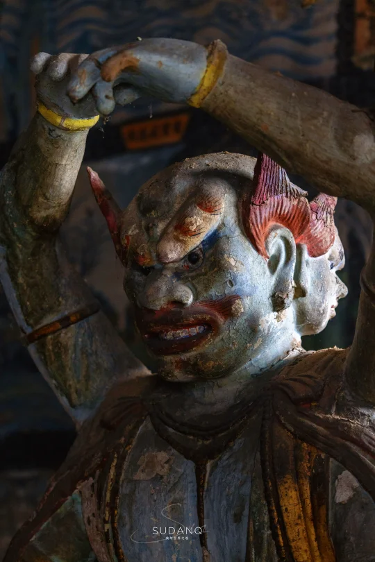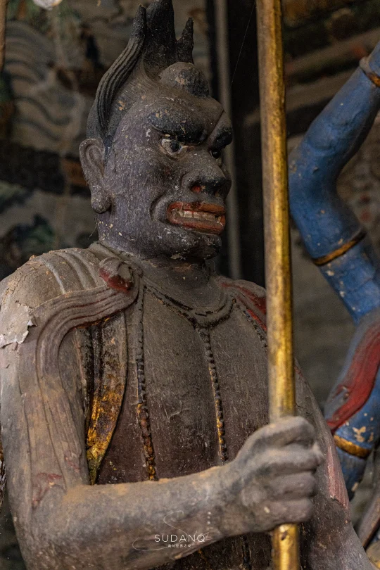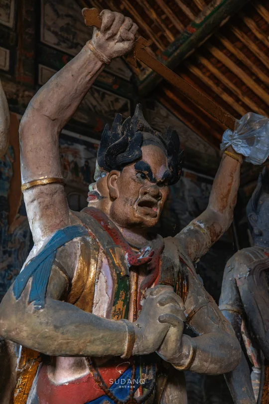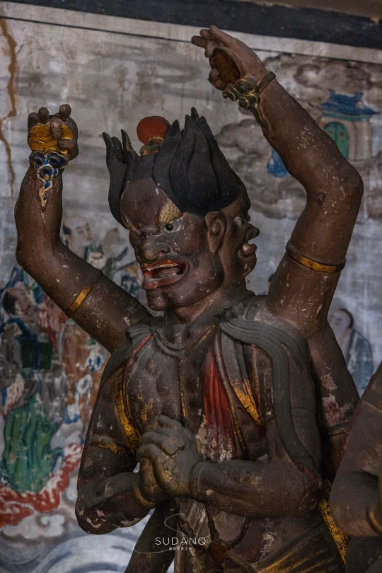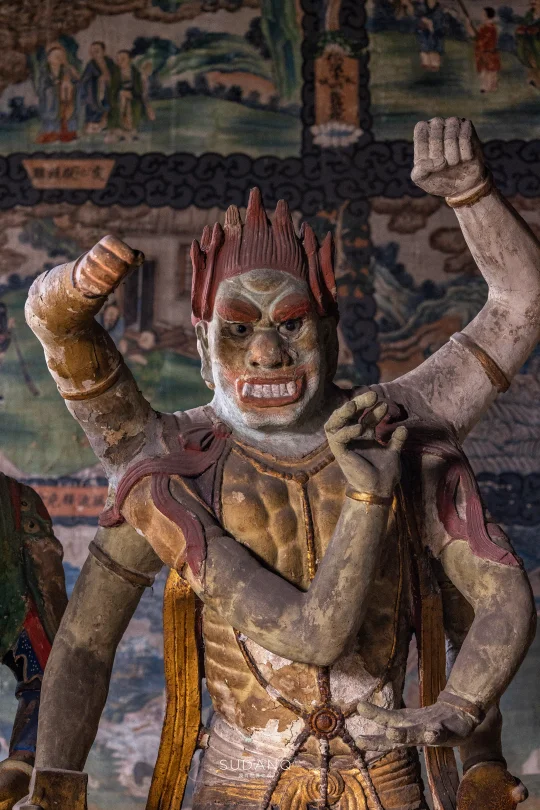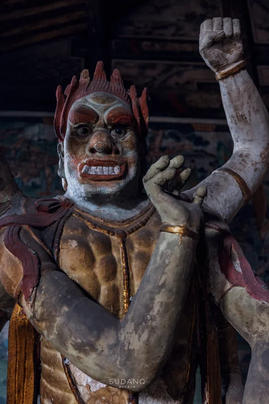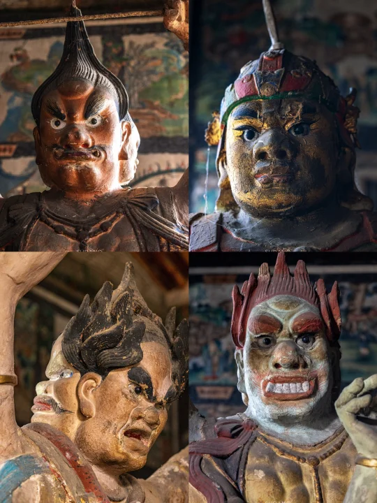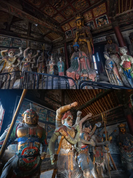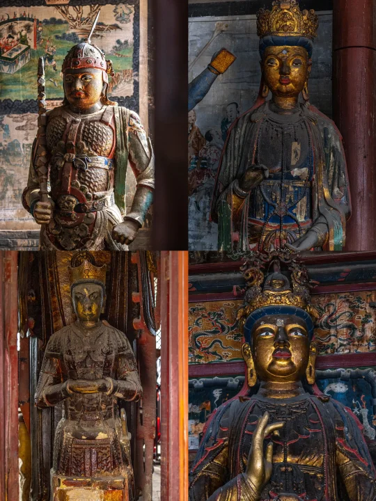 6米高的贴金观音立像,衣纹流畅、神态安详,两侧八大明王塑像和两大护法威严庄重,体现了辽代佛教文化的丰富与多元。