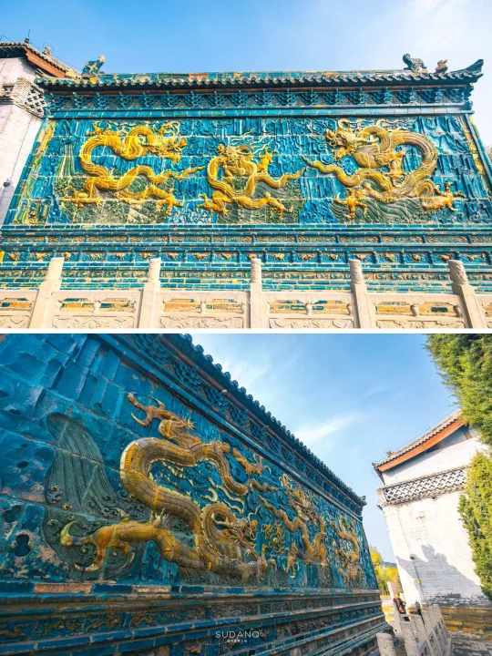 大同唯一的双面琉璃照壁,北面火珠龙纹象征皇权,南面云纹龙呼应佛教意境,底座浮雕含麒麟、狮子等祥瑞图案。