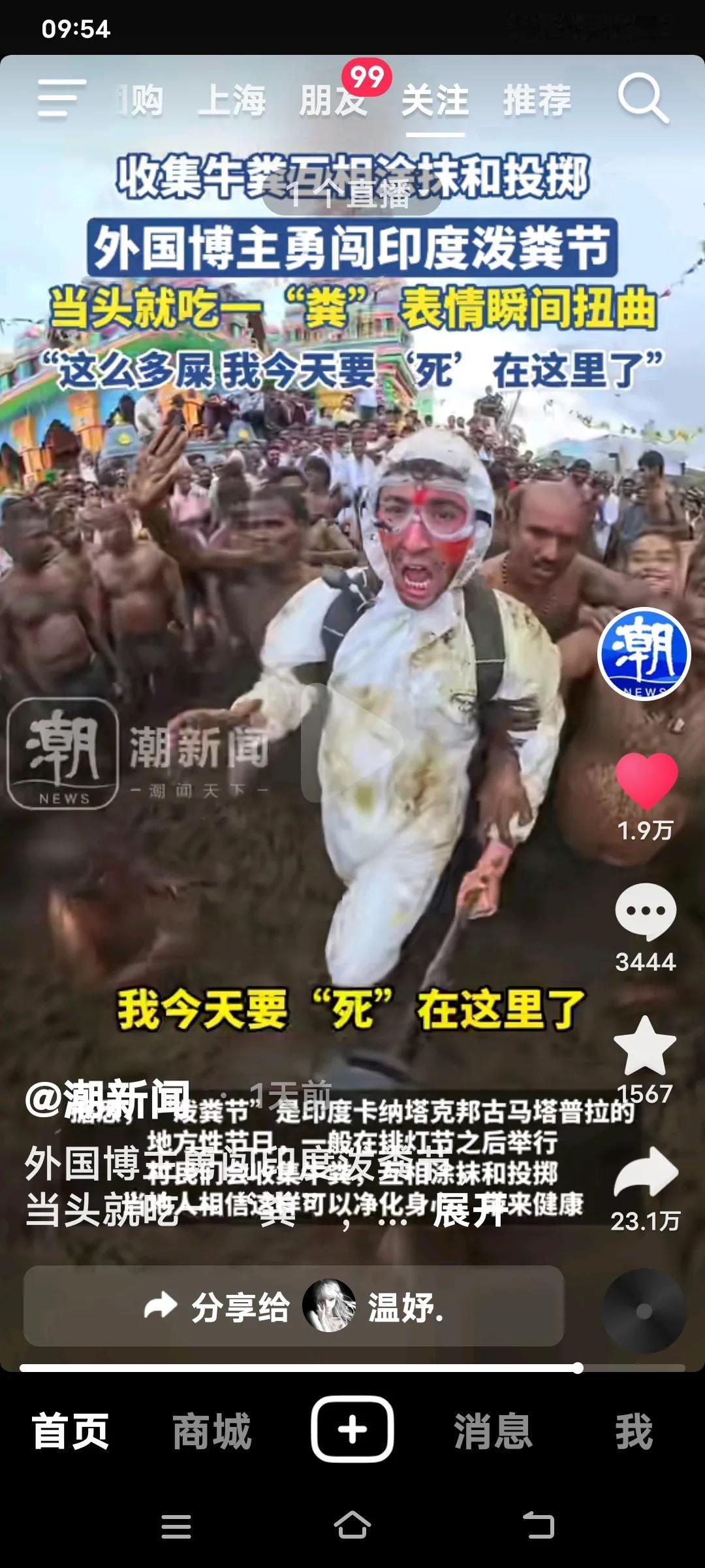 最近刷到外国博主勇闯印度“泼粪节”的视频,简直大开眼界。这个美国博主跑到印度南部某地体验当地年度节日,在视频里,当地人聚在一起相互涂抹、泼洒牛粪,说是以此来祝福。 这博主也是够勇,直接参与进去。可那尝粪体验估计让他瞬间崩溃了,想象一下那味道和触感,一般人真扛不住。估计很多人看到这视频都会庆幸自己没去现场,这节日的独特习俗,不是所有人都能接受的,不知道这博主回去得花多长时间来“净化”自己。 这下真算领教了印度波洒牛粪的滋味了,大声喊到“这么多粪我今天要死在这里了″有网友说,有波水节但没有见过波粪节,那个美国博主还张着嘴,“这是明摆着要吃粪吗?”怎么也得把嘴闭上吧!印度庆祝活动 印度狂欢节日 印度民俗文化