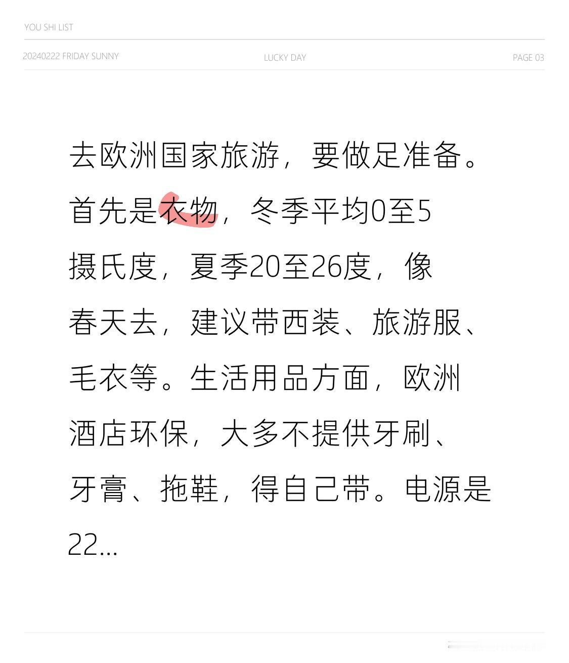 去欧洲国家旅游,要做足准备。首先是衣物,冬季平均0至5摄氏度,夏季20至26度,像春天去,建议带西装、旅游服、毛衣等。 生活用品方面,欧洲酒店环保,大多不提供牙刷、牙膏、拖鞋,得自己带。电源是220伏,但插座是圆孔,电器得配转换插座。常用药品也别忘,欧洲买药要处方且费用高。 文化习俗得了解,不同国家差异大,入乡随俗才不会冒犯当地人。出行前办好有效签证,护照有效期得超六个月。财物安全要重视,人多地方别带太多现金和贵重物品。另外,遵守当地交通规则也很关键。