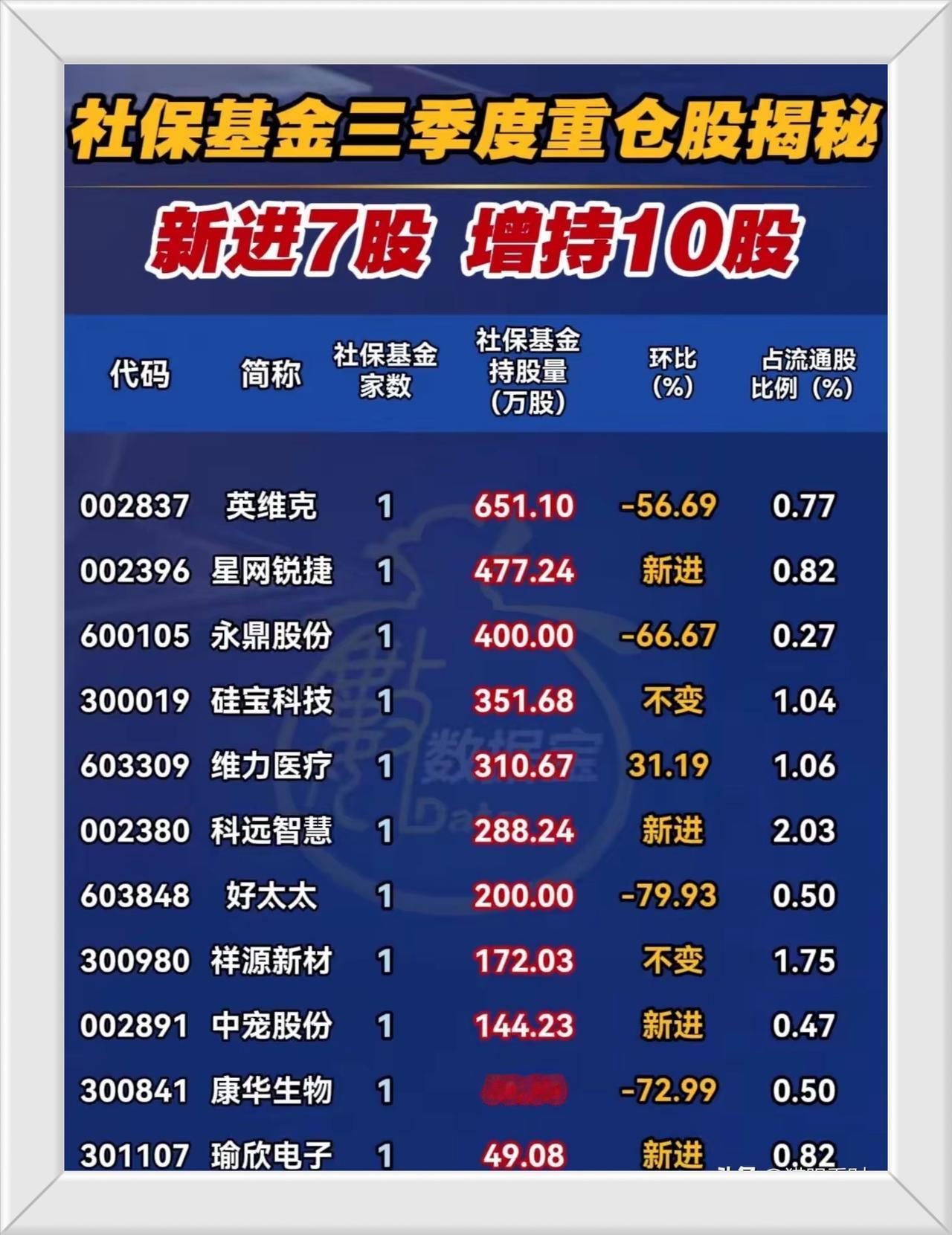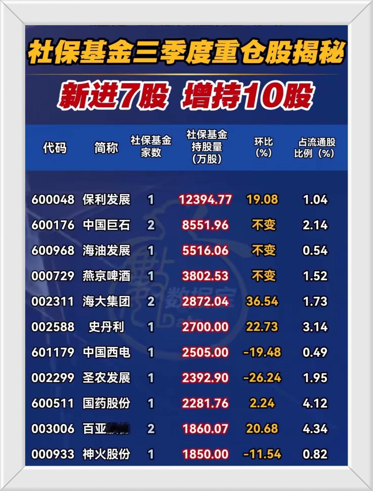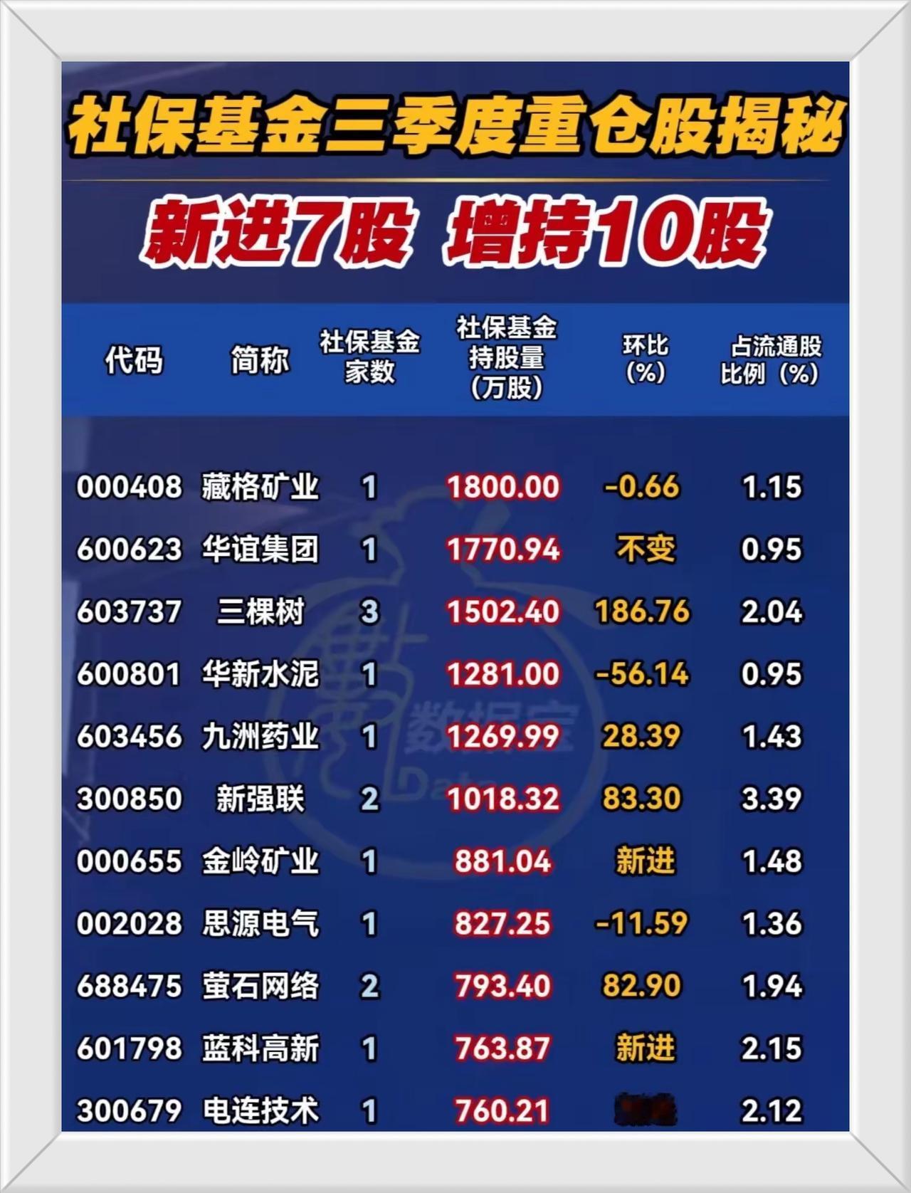 “社保基金三季度重仓股揭秘”,展示了2025年第三季度全国社保基金在A股市场的持股情况,重点包括: ✅ 总体概况(综合三张图): - 新进股票(首次买入):7只 - 增持股票(持股量增加):10只 - 持股量不变:若干只 - 减持股票(持股量减少):若干只 每张图分别列出了部分社保基金重仓股的具体信息,包括: - 股票代码与简称 - 持有该股的社保基金家数(即有几只社保基金组合持有该股) - 社保基金持股数量(万股) - 环比变化(即与上季度相比持股数量的变动百分比) - 占流通股比例(即该社保基金持股数占该股票总流通股的比例) 📌 分图片核心内容梳理: 第1张图(部分重仓股): - 包含股票如:英维克、星网锐捷、永鼎股份、硅宝科技、维力医疗、科远智慧、好太太、祥源新材、中宠股份、康华生物、瑜欣电子 - 新进股票举例:星网锐捷、科远智慧、中宠股份、瑜欣电子 - 减持明显股票举例:英维克(-56.69%)、永鼎股份(-66.67%)、好太太(-79.93%)、康华生物(-72.99%) - 持股不变举例:硅宝科技、祥源新材 第2张图(更多重仓股): - 包含股票如:藏格矿业、华谊集团、三棵树、华新水泥、九洲药业、新强联、金岭矿业、思源电气、萤石网络、蓝科高新、电连技术 - 新进股票举例:金岭矿业、蓝科高新、电连技术 - 大幅增持举例:三棵树(+186.76%,社保基金家数3家,持股1502.40万股)、新强联(+83.30%,社保基金家数2家,持股1018.32万股)、萤石网络(+82.90%,社保基金家数2家,持股793.40万股) - 持股稳定举例:华谊集团(持股1770.94万股,环比不变)、华新水泥(-56.14%减持) 第3张图(更多核心重仓股): - 包含股票如:保利发展、中国巨石、海油发展、燕京啤酒、海大集团、史丹利、中国西电、圣农发展、国药股份、百亚股份、神火股份 - 增持明显举例:海大集团(+36.54%)、史丹利(+22.73%)、百亚股份(+20.68%) - 持股量大且稳定举例:保利发展(社保基金持股12394.77万股,占流通股1.04%)、中国巨石(8551.96万股,占2.14%) - 持股量较大但环比下降举例:中国西电(-19.48%)、圣农发展(-26.24%)、神火股份(-11.54%) 🔍 综合分析要点: 1. 社保基金投资风格稳健,偏好业绩稳定、行业地位突出的公司,如保利发展(地产)、中国巨石(建材)、海油发展(能源)、燕京啤酒(消费)、海大集团(农业/饲料)、国药股份(医药)等。 2. 新进股票(7只)往往是社保基金开始关注并尝试建仓的标的,如金岭矿业、蓝科高新、电连技术、中宠股份、瑜欣电子、科远智慧、星网锐捷,可能代表新的投资方向或潜力板块。 3. 大幅增持股票(如三棵树、新强联、萤石网络、史丹利、百亚股份等)显示社保基金对这些公司未来增长较为看好,尤其是三棵树(涂料)、新强联(风电零部件)、萤石网络(智能家居/物联网)、百亚股份(个护用品)等中小盘成长股。 4. 减持或持股量下降明显的股票(如英维克、永鼎股份、好太太、康华生物、中国西电、圣农发展、神火股份等),可能是基于估值、行业周期或短期业绩考虑进行的调整。 ✅ 总结一句话: 2024年三季度,社保基金整体持仓结构有所调整,既保持了对优质大盘蓝筹股(如保利发展、中国巨石)的稳定持有,也积极新进和增持了一批具备成长潜力的中小盘股(如三棵树、新强联、电连技术、中宠股份等),同时减持了部分短期表现不佳或估值偏高个股,体现出稳健与灵活并重的投资策略。