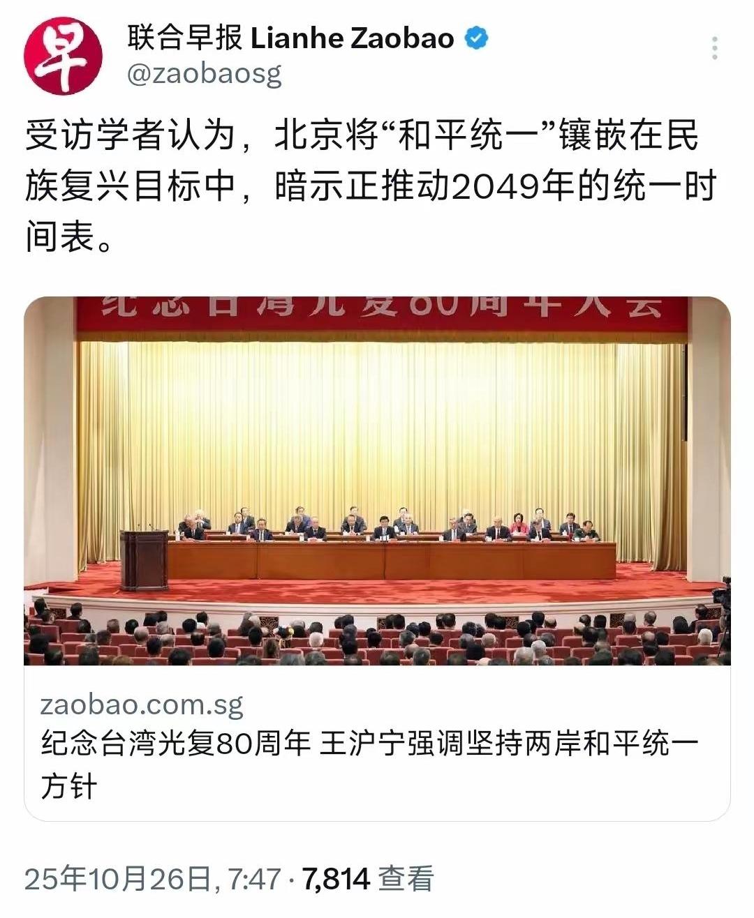 联合早报今天(10月26日)写道道:“北京将‘和平统一’镶嵌在民族复兴目标中,暗示正推动2049年的统一时间表。” 不排除以任何手段的统一从来就是伟大民族复兴的目标之一,但联合早报这段话却把“和平统一”说成是“镶嵌在民族复兴目标中”,这是刻意而为的误导,也是新加坡近日频繁就稀土管制决定说三道四后对中国的又一恶意揣测。 这个可恶的小蚂蚁需要收到、受到严厉警告,如若再不闭嘴,最先被碾死的可能就是它。