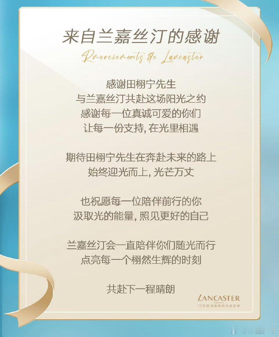 田栩宁兰嘉丝汀官宣期战报兰嘉丝汀给田栩宁的感谢信 品牌的感谢信就是最好的勋章!田栩宁用3500万销售额、5亿曝光的硬核数据,证明了自己不止有流量更有强带货力。就像之前带火兰嘉丝汀防晒时那样,他总能靠真实体验戳中用户需求,这样的商务实绩难怪让品牌青睐有加!