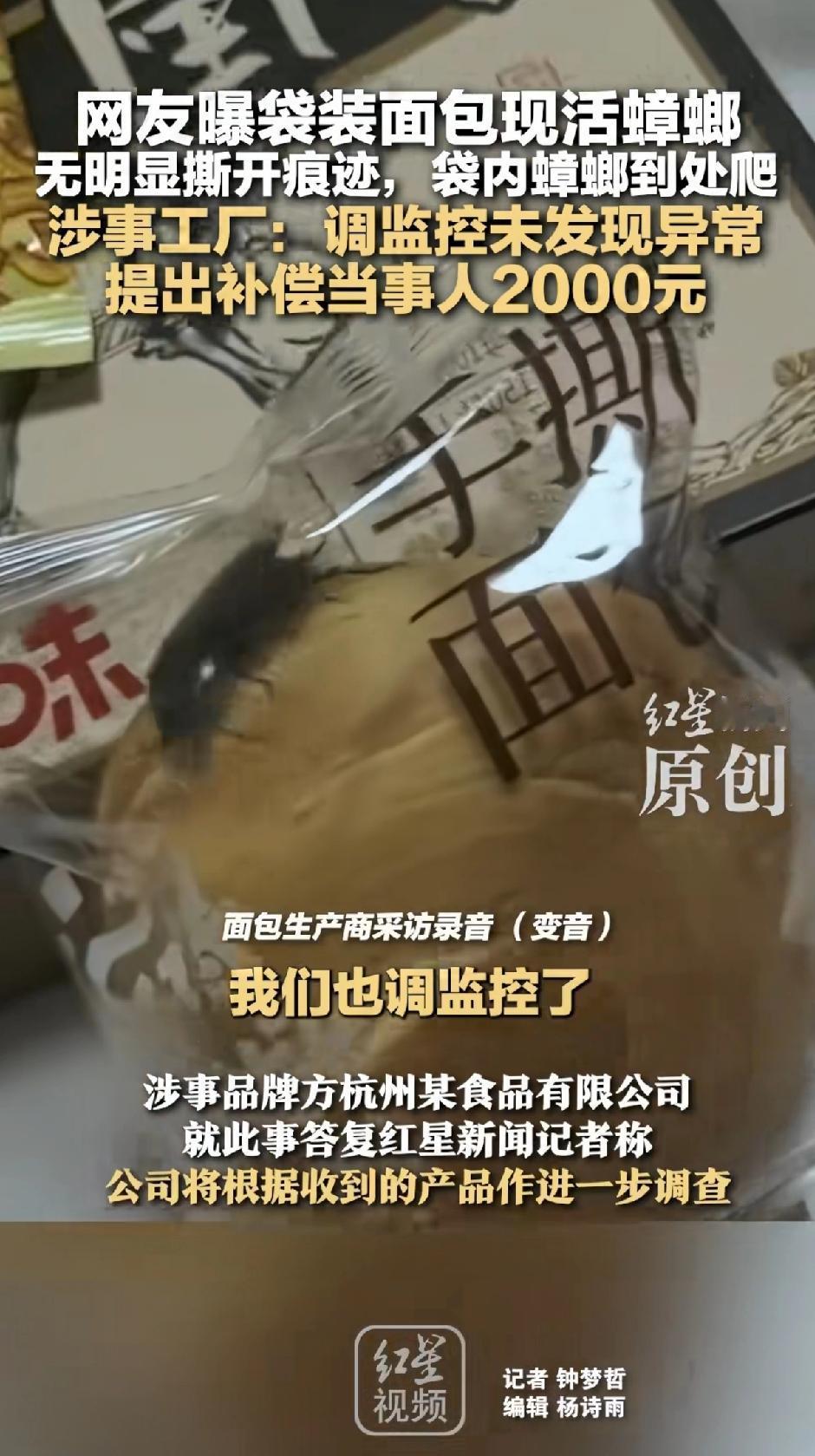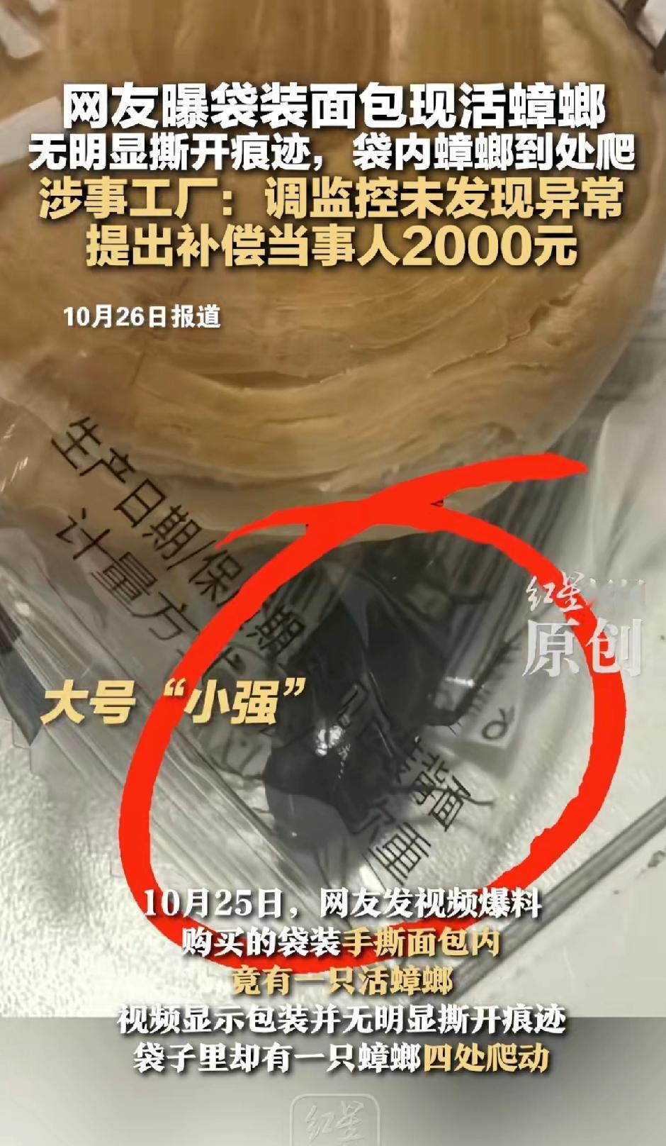 网友爆袋装面包现活蟑螂,社交平台上消费者的投诉让人惊掉下巴。 有消费者买的独立包装面包里竟有活蟑螂!视频里,黑色蟑螂在面包袋里爬,袋子疑似封装完好。 这面包是10月22日在某品牌官方旗舰店花29.9元买的,24日收到货。 该品牌客服已联系消费者寄回调查。 还有网友网购的手撕面包内也有活蟑螂,包装无明显撕开痕迹。 这么大的蟑螂不是一时半会长那么大的,而且面包完整性那么好,看来蟑螂情愿把自己饿瘦了也不吃面包! 面包比蟑螂更可怕。 涉事工厂称生产线标准且虫害处理好,调取监控无异常,提出补偿当事人2000元。 这面包里出现活蟑螂,实在让人恶心,希望能尽快查明真相,给消费者一个交代。