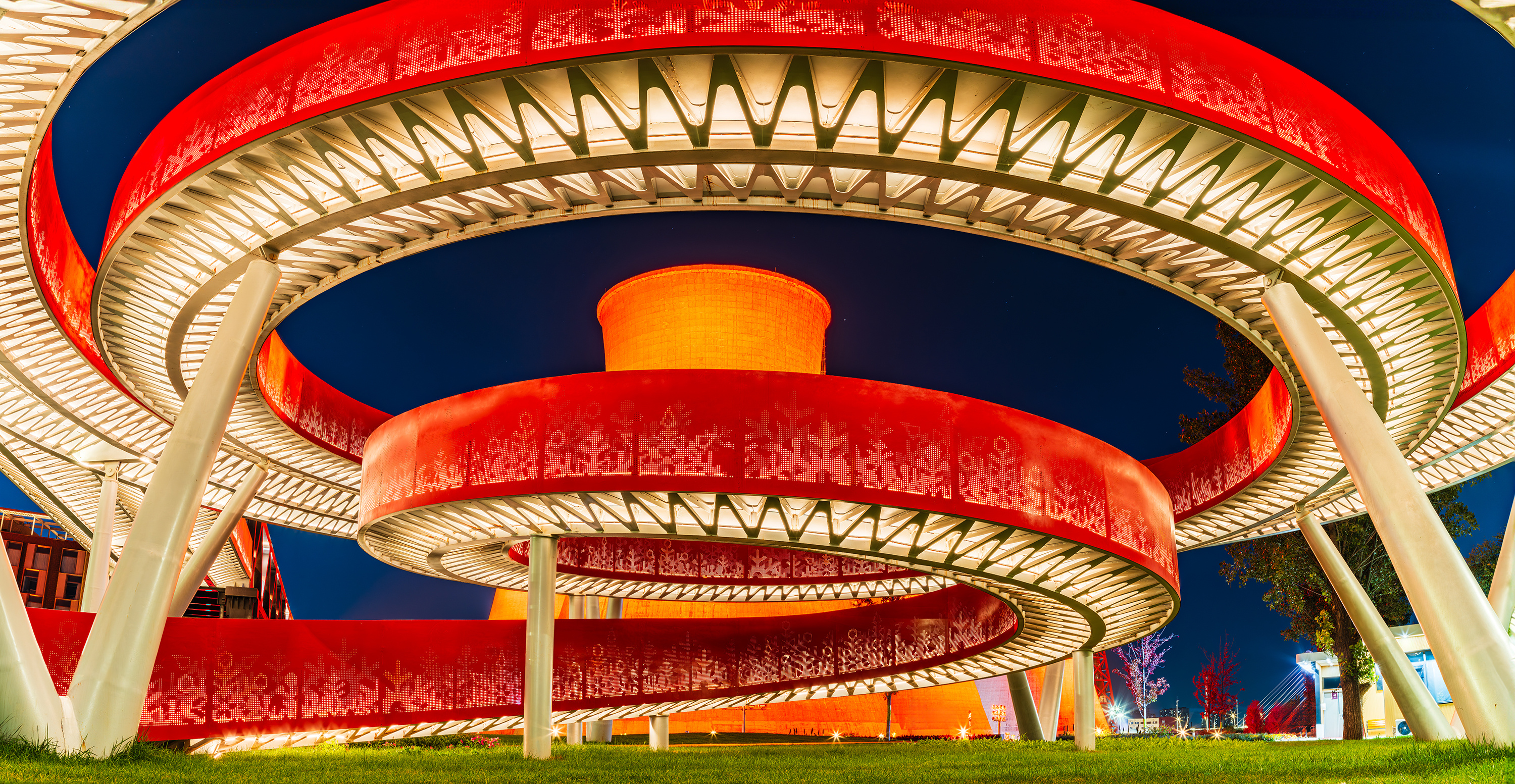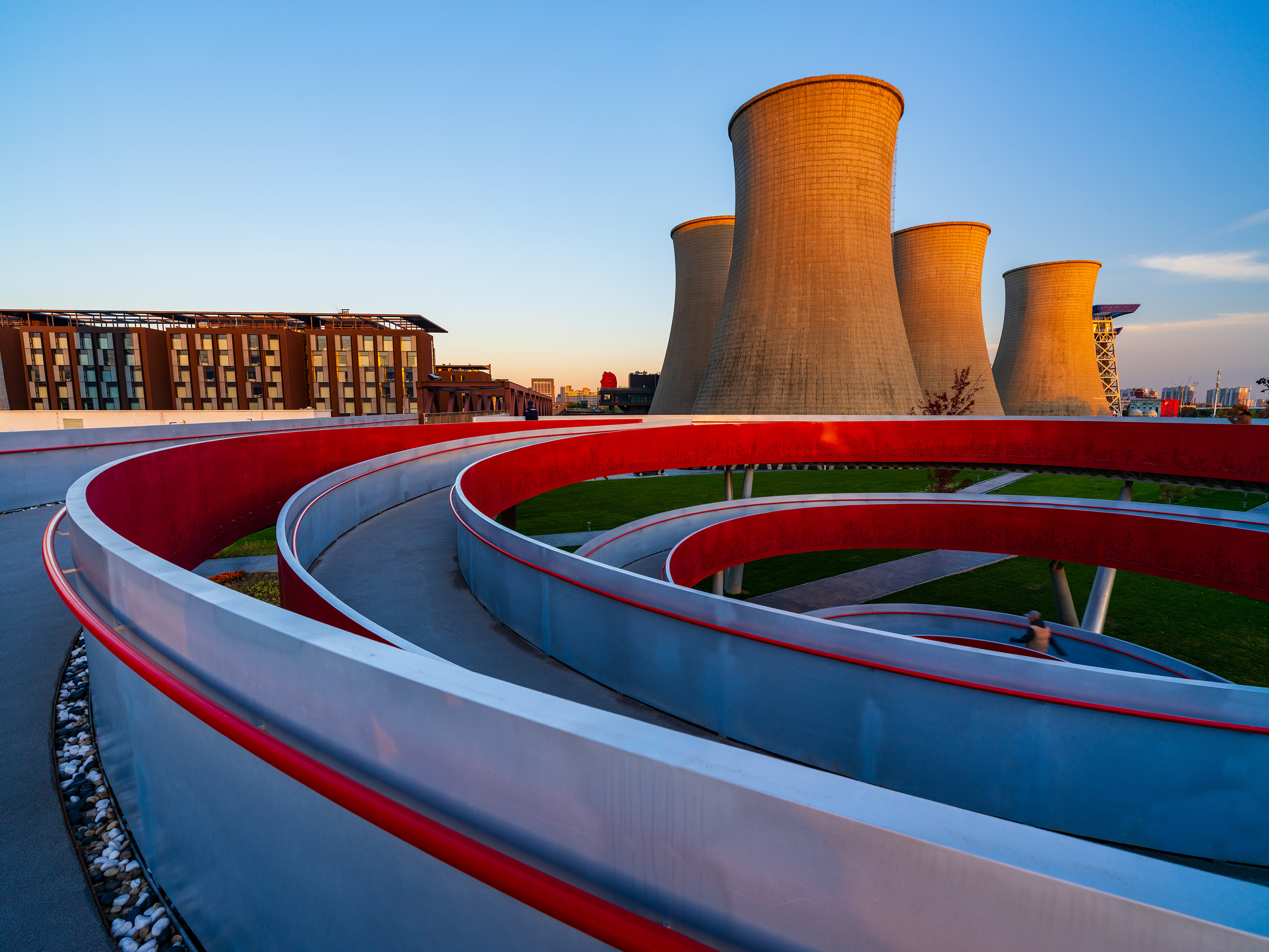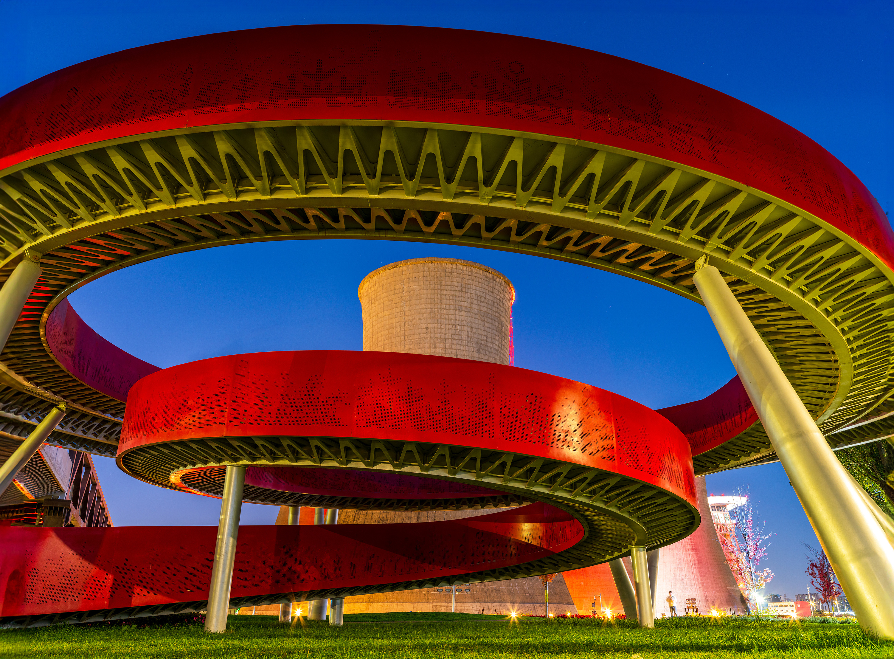 首钢园的红飘带旋转楼梯,绝对是工业遗产活化的标志性景观,红色钢制螺旋结构,镂空面板蚀刻植物纹样,与背景灰色冷却塔形成 “新工业美学” 对比;夜晚灯光勾勒轮廓,工业粗粝与艺术灵动交融,成为 “旧厂房→文创地标” 转型的视觉缩影 。哈苏X2DII,20-35镜头拍摄。