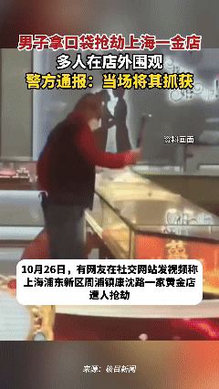 10月26日,居然有人大白天在上海抢劫金店?瞧这哥们那动作,拿着个小铁锤一锤又一锤,你是在抢劫啊,这状态也太淡定放松了些吧? 事发于上海浦东新区周浦镇康沈路一家黄金店,时间是26日上午10时55分许。 37岁的男子曹某,戴着墨镜和口罩,正用小铁锤慢悠悠敲击金店的展柜玻璃……门外不少市民正在围观! 看完视频,我有些震惊了! 曹某这淡定的架势,根本不像是在抢劫金店,更像是在自家客厅修理家具?气氛没对啊,怎么不是港片那种紧张刺激的场面呢? 曹某随后拿出一个大口袋,装好了被抢的黄金首饰就准备离开……好家伙,你这0元购的倒是随心所欲,完全对法治社会的威严视若无睹? 很快,警方到达现场,并抓住了曹某,有照片显示曹某被五花大绑摁在地上动弹不得! 光天化日之下抢劫金店,而且就拿一个小铁锤敲敲敲,接着随便拿个大口袋装一装就想离开?曹某是不是精神方面有问题啊? 现如今这社会治安如此安定,谁还会上赶着往枪口上撞?在大上海繁华地段抢劫金店?确实是活腻歪了…… 目前,曹某已经被捕刑事拘留,案件还在进一步审理中。 各位觉得这曹某是几个意思?即便是再没钱,也不至于抢劫金店吧?就凭你这手里的小铁锤?这配置实在太LOW了啊! 真是无语中…… 大家觉得呢?曹某这是个什么心思?难道他以为自己是能进能出的铁道游击队?太奇葩了……