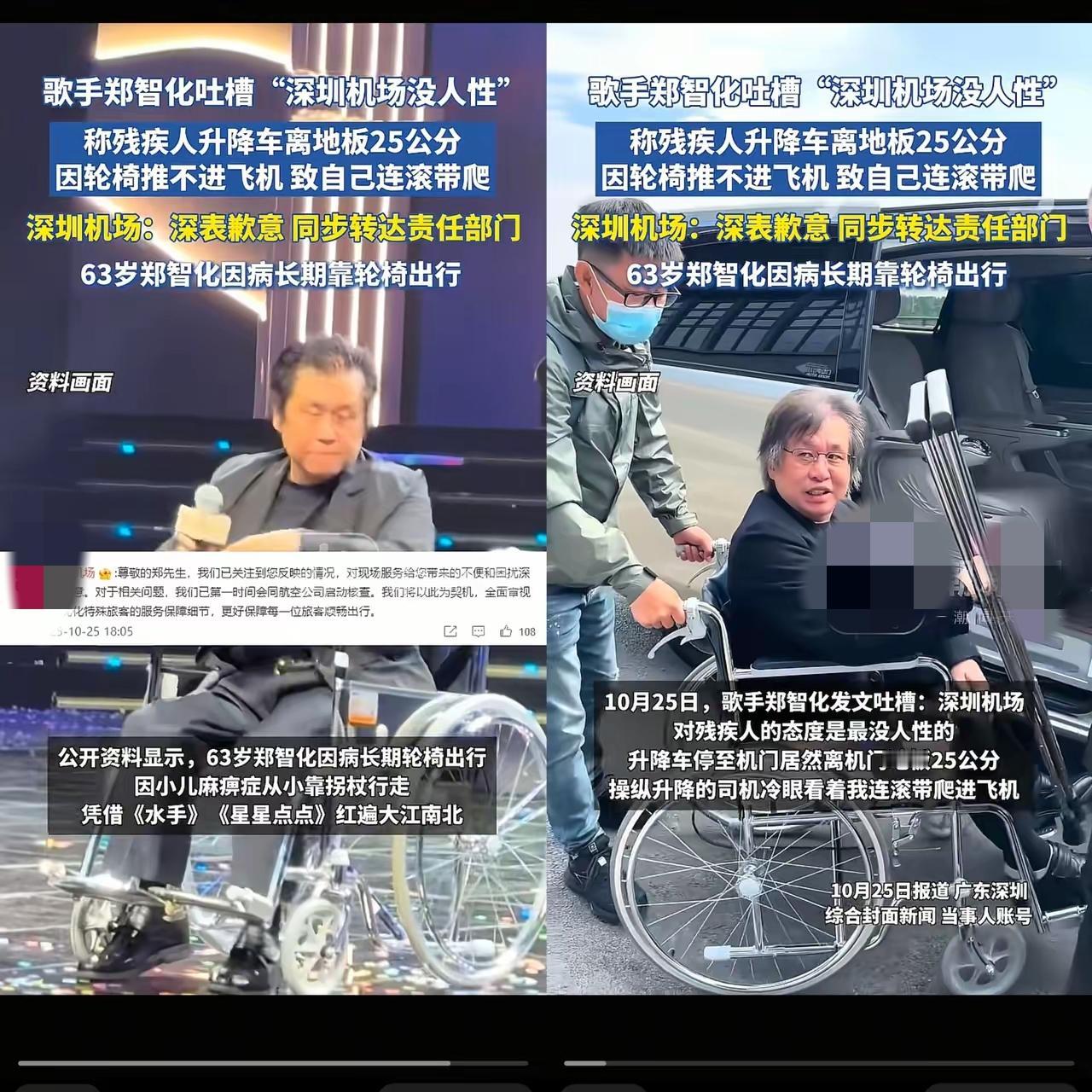不止郑智化破防了,深圳人看了这事儿恐怕都得沉默——这就是以“发达”“包容”自居的城市该有的温度吗? 郑智化坐轮椅登机,升降车和机舱差着25公分,自己进退两难,司机却冷眼旁观。虽说机场后来解释是怕刮碰飞机留了安全距离,但这“安全”咋就没把人的尊严算进去?更戳心的是,他是公众人物,发声后还有人回应,换成普通残疾人,这委屈怕是只能咽肚里。 深圳街头的盲道常被占、有断点,机场的无障碍设施成了“半障碍”,这哪是设施问题,分明是服务意识的缺位。城市的高度从不是靠高楼堆的,是看弱者走得顺不顺、活得有尊严没。 你觉得无障碍设施,是先有“设施”重要,还是先有“让人用得舒服”的心思重要?