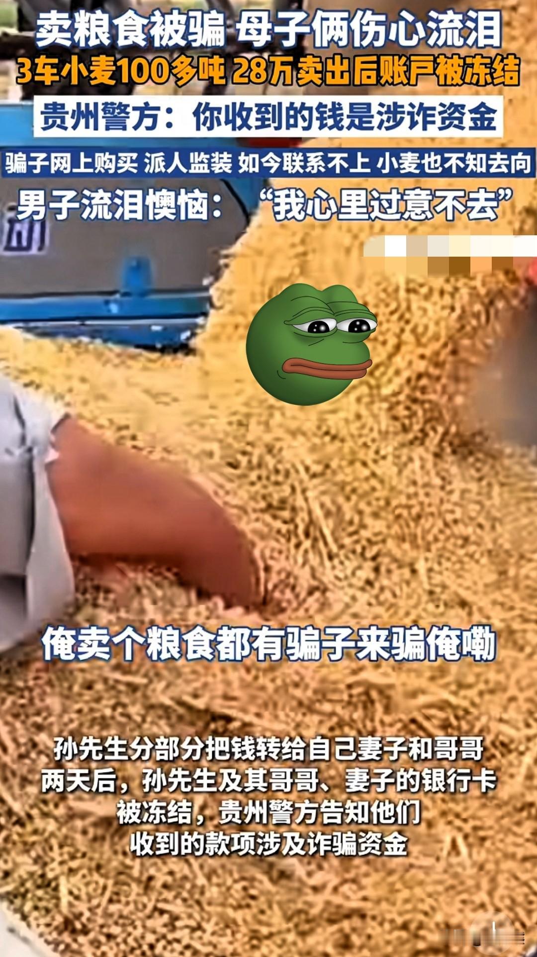 新型诈骗 这局怎么破? 卖粮被骗的情况比较复杂,专门诈骗卖粮的人一般都会有技术含量。 他们通过让受害人直接支付给卖粮人的方式来骗取受害人的钱,这样一来受害人的钱就被认为是卖粮人的收入,而不是诈骗犯所得。 卖粮人的钱就成了受害者的钱,被冻结。诈骗犯再卖粮,那就成了正当的钱了。 这骗局太阴了!骗子把赃款包装成粮款,自己全身而退,却让卖粮的背锅。银行就不能早点识别异常资金吗?别等出了事才冻结账户! 这骗局真缺德!卖粮的别只看钱到账,非买家付款要多留心。也盼着监管和宣传跟上,别让老实人种的粮白被骗。这局怎么破?大家有没有办法?欢迎评论区留言。诈骗