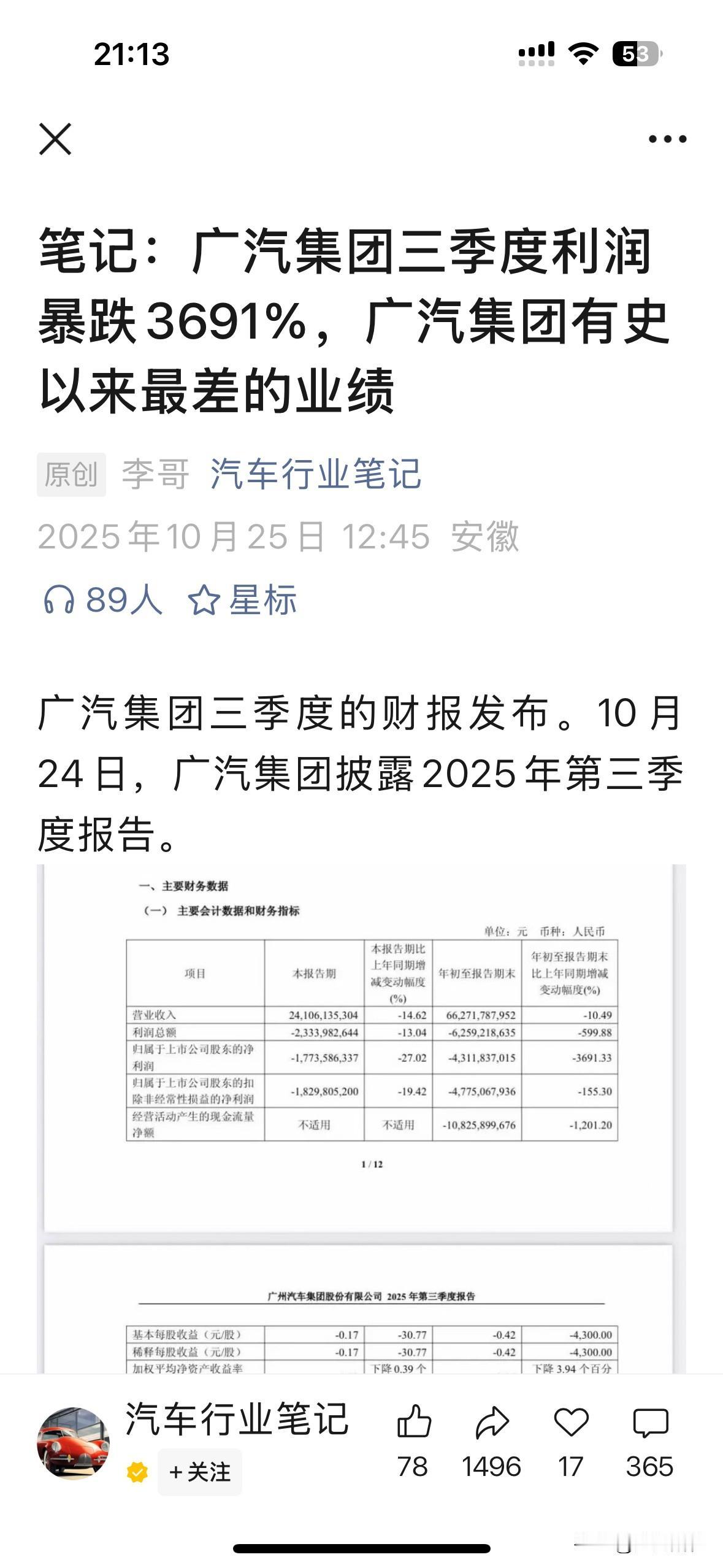 保时捷利润暴跌99%! 广汽集团三季度利润暴跌3691%,广汽集团有史以来最差的业绩! 有业绩靓丽的新能源车企,就有黯淡坠落的老车企。 谁能涅槃重生?谁又会在明晨消失? 答案只有在风里吧!