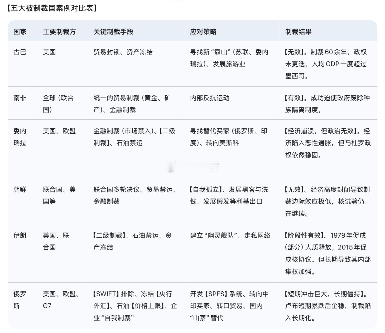(i) 案例:【古巴】。制裁几十年无效,关键原因是【只有美国在制裁】,而全球几乎所有其他国家(包括欧盟、中国、委内瑞拉)都在与古巴进行贸易。