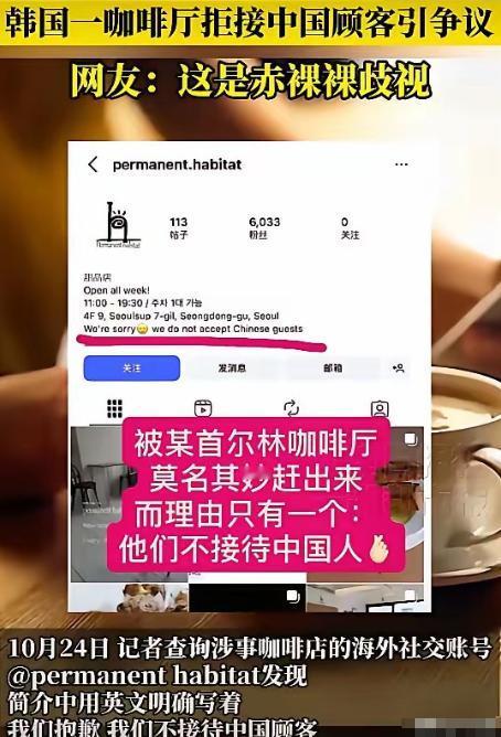 中国游客去韩国一咖啡厅,结果得知她是中国人后,竟然将她们直接赶了出去,并表示她们不接待中国人,甚至还在店铺门口,贴上不招待中国顾客。眼见事情闹大,咖啡店老板却不以为然,仍然强硬表示:我们很抱歉,但我们就是不接待中国顾客! 2025年10月,首尔圣水商圈某咖啡厅的线上评分从4.7分跌至2.3分,近三天预约量归零——这组刺眼数据的背后,是一场发生在韩国对中国团体游客免签政策落地后的消费纠纷。 同一时期,明洞商圈的餐饮商户却迎来客流小高峰,部分店铺因张贴“无差别接待”中文标识,中国游客占比较上月提升15%,两个商圈的不同境遇,折射出跨境消费中的服务差异。 时间拉回10月某工作日上午11点15分,一位中国自由行游客站在圣水商圈涉事咖啡厅吧台前,手里攥着取餐牌,面前是已打包好的耶加雪菲手冲和低糖蓝莓甜点。 就在15分钟前,她还通过支付宝支付了6.8万韩元(约合人民币360元),店员用英文告知“稍等可取餐”,宣传页上“支持跨境支付”“简单中文服务”的字样仍清晰可见。 这些正是她从“韩国旅游必需应用程序”推荐列表里选中这家店的原因。 转折发生在店员的一句询问后。 “你是中国人吗?” 得到肯定答复的瞬间,店员将餐品收回柜台,说“无法提供服务,会退款,请离开”。 游客当场提出质疑,认为点单时未收到任何限制提示,争执中店铺负责人介入,混乱间她的背包滑落,相机镜头轻微磕碰。 最终在隔壁商户协调下,她没能取走餐品,只能带着物品离开,后续将经过整理发布在社交平台。 这条内容很快引发关注。 中国驻首尔旅游办事处第一时间联系游客,协助整理支付凭证、现场照片,对接首尔中区消费者保护中心。 该中心是韩国文化体育观光部2025年重点升级的“跨境消费维权窗口”,此前已处理多起类似咨询。 韩国消费者权益团体“公平交易联盟”也发声,援引《公平交易法》强调“经营者不得无差别对待消费者”,尤其在免签政策吸引更多中国游客的背景下,服务规范性更需重视。 鲜少有人知道,涉事咖啡厅曾是“网红店”。 据圣水商圈管理处信息,事件前该店38%的客源是中国游客,还报名了首尔市政府下半年的“文化观光庆典快闪卖场”活动。 回溯2025年3月,韩国启动“2025自游FUN韩—赏韩春”推广活动时,这家店还在平台发布多语言宣传内容,吸引不少中国游客打卡,谁也没想到半年后会因接待争议陷入困境。 事件的影响还在扩散。 韩国旅游行业协会在一周内更新《2025跨国消费服务指引》,新增“点单前需公示服务限制”条款,将“跨文化服务培训”列为参与官方推广的必备条件。 中国旅游部门也同步提醒游客,结合韩国“旅游通行证”便利措施,消费前核实商户评价,遇权益受损及时联系驻外机构。 这一提醒的背景是,2025年三季度免签政策落地后,携程数据显示赴韩旅行订单环比增长40%,中国游客已连续12个月居韩国入境游客首位。 如今再看圣水商圈,涉事咖啡厅已被暂停参与官方宣传活动,门口偶尔有游客驻足查看评分后离开。 而明洞、弘大等商圈的商户,正借着免签东风优化服务:有的更新中文菜单,有的安排会中文的店员,还有的在传统节日推出限定活动。 一位明洞咖啡厅店长说:“游客来消费,图的是舒心,平等接待不是额外要求,是基本准则。” 这场因咖啡引发的纠纷,本质是服务流程不规范与信息不对称的结果。 在中韩旅游交流持续升温的2025年,商户的每一个服务细节,都可能影响游客对目的地的印象。 唯有坚守平等原则、完善沟通机制,才能让跨境消费成为连接两国民间交流的桥梁,而非引发争议的导火索。 那么到最后,你们怎么看呢? 如果各位看官老爷们已经选择阅读了此文,麻烦您点一下关注,既方便您进行讨论和分享,又能给带来不一样的参与感,感谢各位看官老爷们的支持!