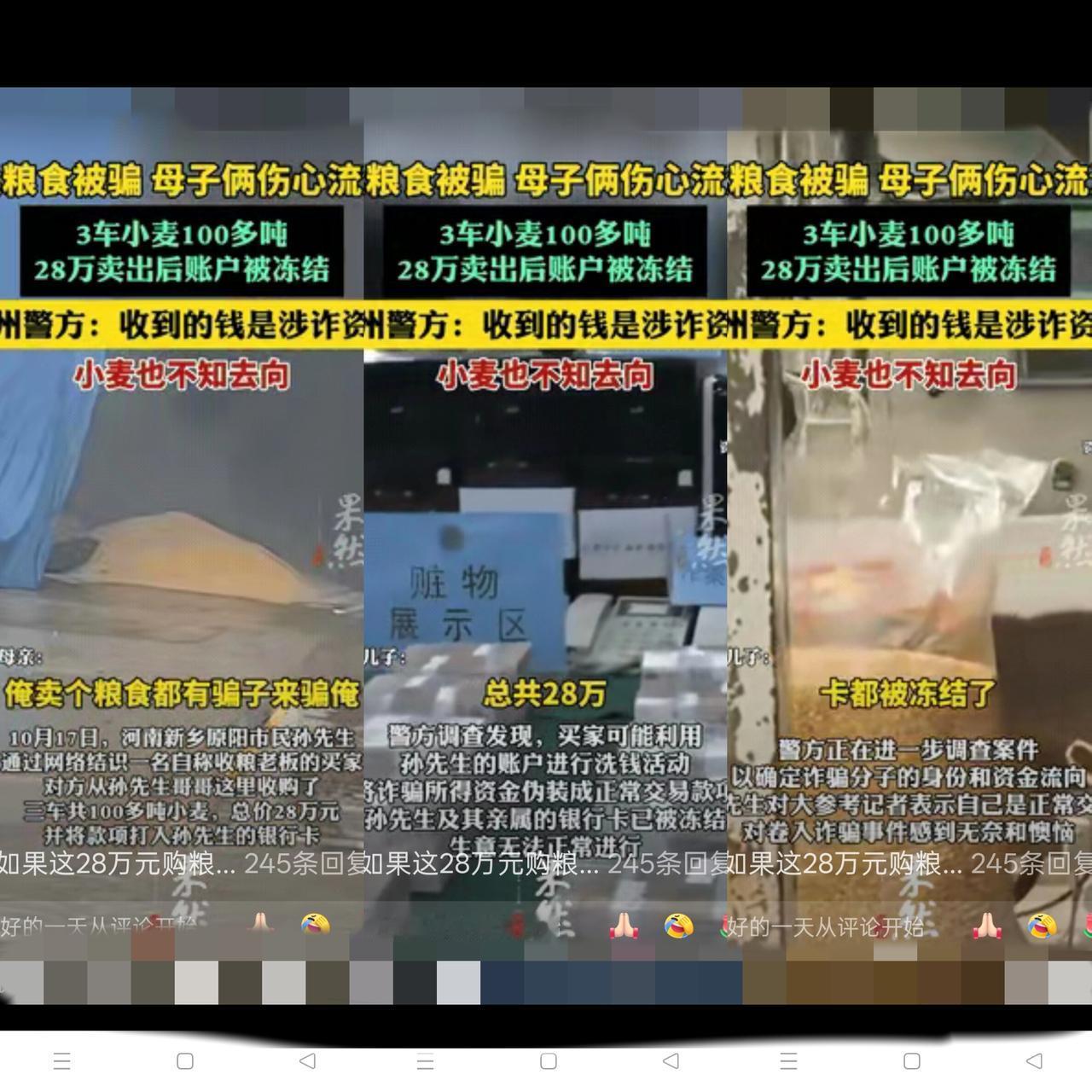 河南新乡母子俩卖3车小麦,100多吨粮食换了28万,刚高兴没多久,银行卡突然被冻结,辛苦钱直接“锁”住了!这哪是赚钱,分明是被骗子坑惨了。 买家是母子俩网上认识的,自称收粮老板,装得特像回事——专门调3辆货车拉粮,还找了人监装。 可谁能想到,这全是骗子的套路,打过来的28万竟是涉诈资金,对方压根是想借卖粮洗钱。 现在买家失联,小麦找不着,连监装的人都毫不知情,母子俩急得是直掉眼泪。 我是真的气不过,骗子专挑老实农民下手,就欺负他们没防范经验、轻信人,赚这种血汗钱良心能安? 其实防这种骗很简单,大额交易别只电话聊,一定要让对方当面对接,骗子最怕露脸,一要求当面就会找借口溜。 你们平时大额收钱都会做哪些防范?评论区分享下经验,帮更多人避坑!