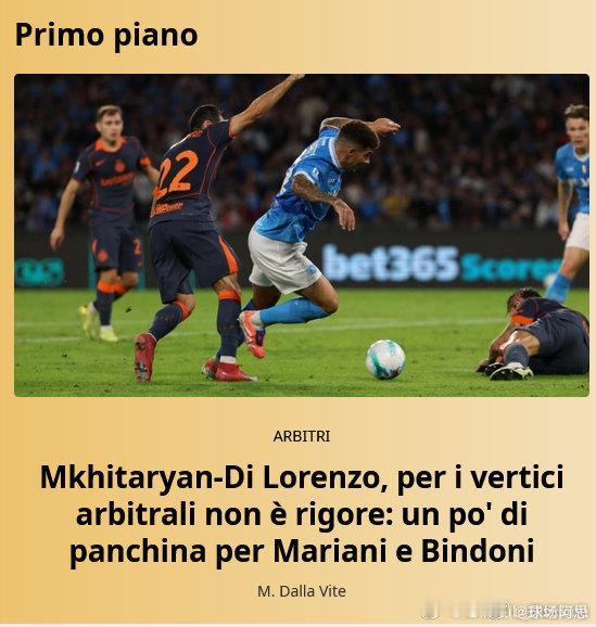 米体:意大利裁判委员会确认昨晚那不勒斯获得的点球是一次巨大的失误,点球完全不存在,边裁宾多尼幻觉式的判定点球占主要责任,主裁马里亚尼轻易取信宾多尼的建议并改判其次,VAR未介入再次,三人将根据责任等级在未来数周停哨。