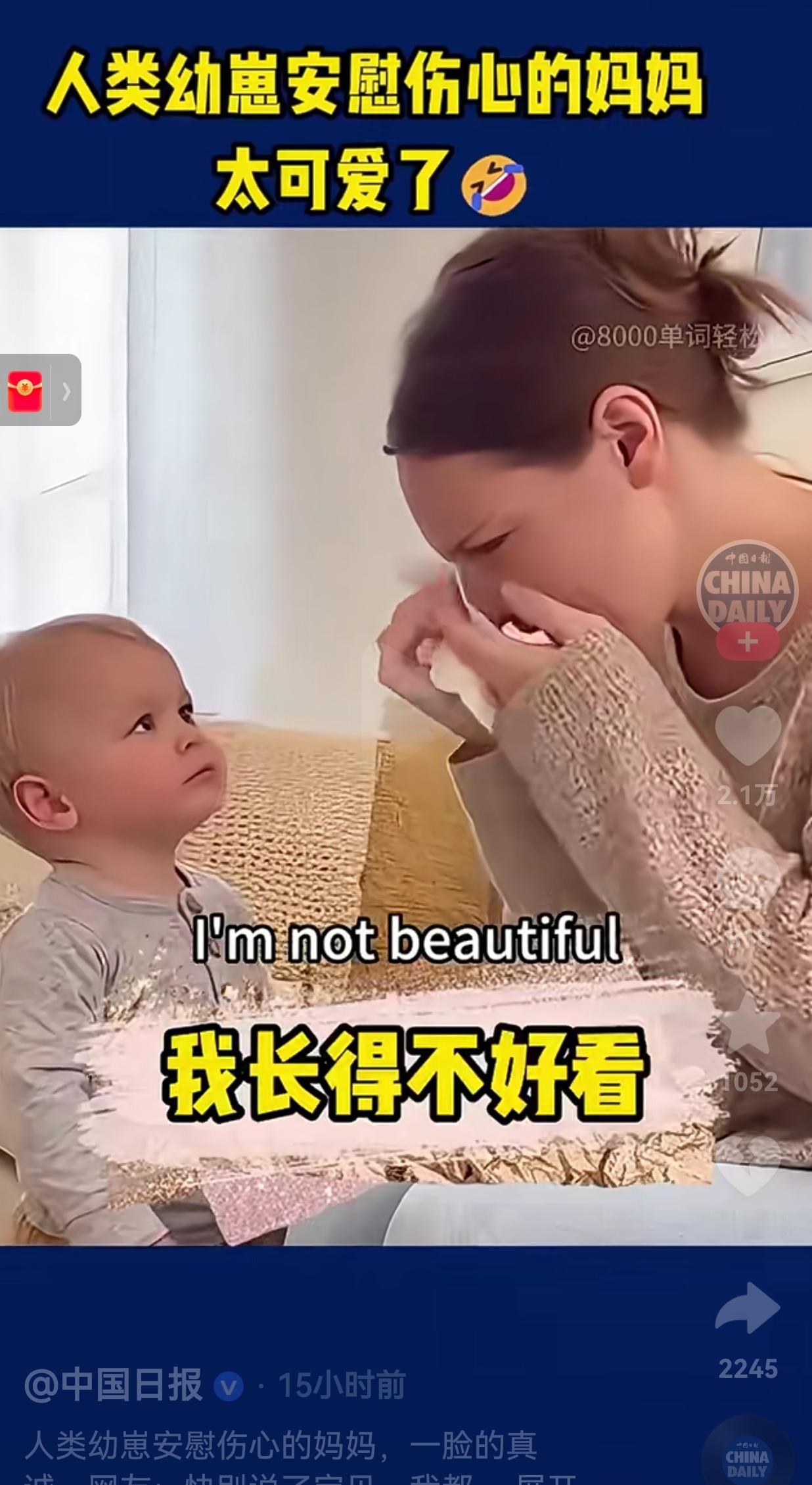 看给孩子难为的,这妈妈也太不让人省心了!一女子当着萌娃的面,哭着对萌娃说:“我长得不好看。”说着说着,哭的更大声了。 萌娃看到妈妈很难受,于心不忍赶紧上前安慰妈妈,萌娃说:“妈妈别哭了,爸爸长得也不好看,大家长得都不好看。” 听到萌娃的安慰,妈妈这才停止哭泣,一把将懂事的孩子拥入怀中。 网友看到后评论说,他认同了你的不好看,还给你找来了一堆不好看的伙伴。 还有的网友说,宝宝你不是应该说,不妈咪,你长的很美,我们都很美!你对自己要求太高了! 这妈妈真的太会为难孩子了,当着孩子的面,竟说这些有的没的。好看又如何,不好看又能怎地呢? 你在老公面前抱怨几句就行了,你在孩子面前说这些干嘛呢?难道是为了让孩子夸你美吗? 可是,孩子听不懂你这些言外之意,孩子知道安慰你,就已经够懂事的了!希望你别再无理取闹为难孩子了! 大家觉得呢?欢迎大家评论区讨论留言。