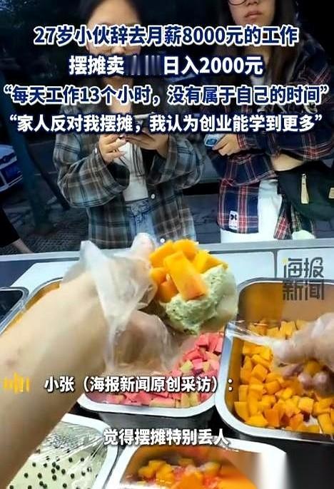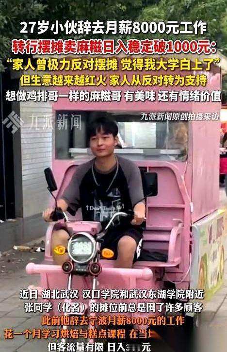 一个月薪八千的稳定工作,说不要就不要了。 一个27岁的小伙,辞职跑去夜市卖麻糍。 然后,赔了个底朝天。头十天,连饭钱都挣不回来。 看到这儿,是不是心里咯噔一下,觉得“看,又一个瞎折腾的”? 别急。 这哥们儿最牛的地方,不是他敢辞职,而是他敢在赔钱之后,把整套设备从宁波打包,用货车拉回武汉。 就因为他琢磨明白了:我在一个上班族匆匆路过的地方,卖给谁啊?我得去年轻人扎堆的地方! 这行动力,这复盘能力,说真的,在哪个公司干都是把好手。 他那辆自己刷的亮粉色三轮车,挂上灯带,在夜市里骚气得不行,老远就能看见。 菜单也玩出了花,什么芒果奶酪、茉莉青提……听着就想尝尝。 他还胸前挂个运动相机,跟每个客人聊天,谁爱吃甜的,谁不吃香菜,他都记着。 后来,队伍能排出五十多米。 一天净赚八百多。 家里人从一开始觉得“大学白上了”,到现在成了他的“后勤保障部”。 这故事里,我看到的不是“读书无用”,也不是“摆摊比上班好”。 我看到的是,一个人真正为自己活着的模样。 上班,你是公司这台大机器里的一颗螺丝钉,你的价值是老板定义的。 摆摊,你是自己这艘小船的船长,风浪再大,方向盘在自己手里。 那种看着几十号人排着队,就为了吃一口你亲手做的东西的踏实感…… 说真的,多少钱一个月也换不来。
