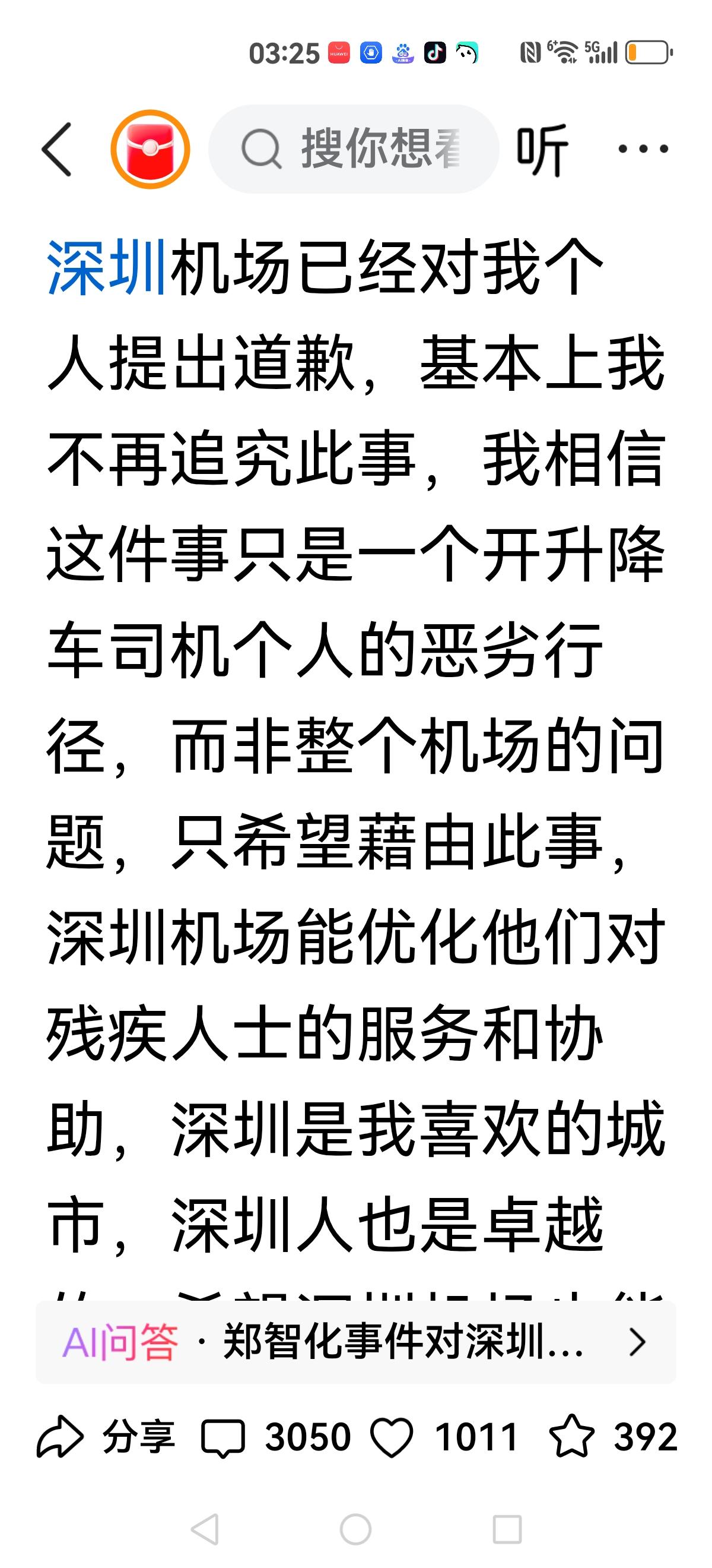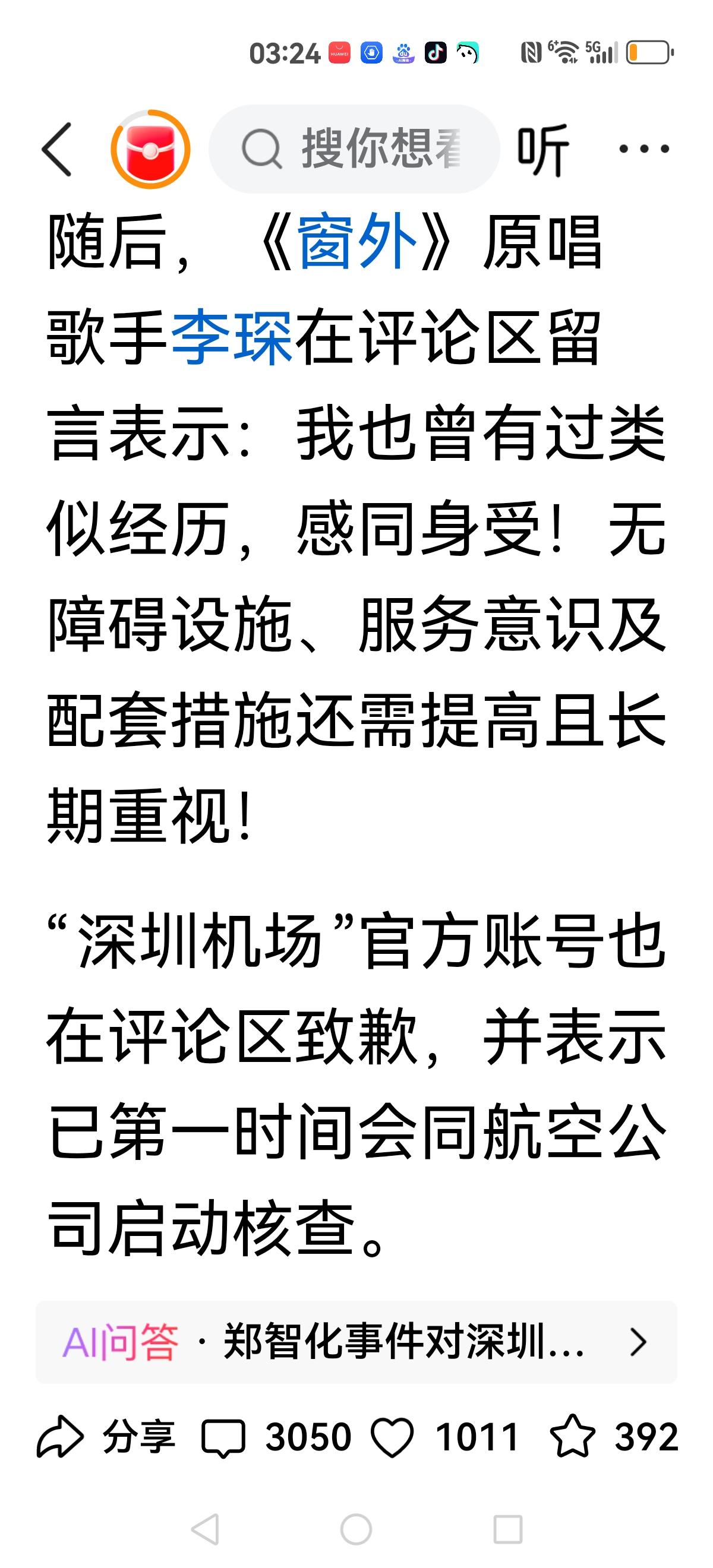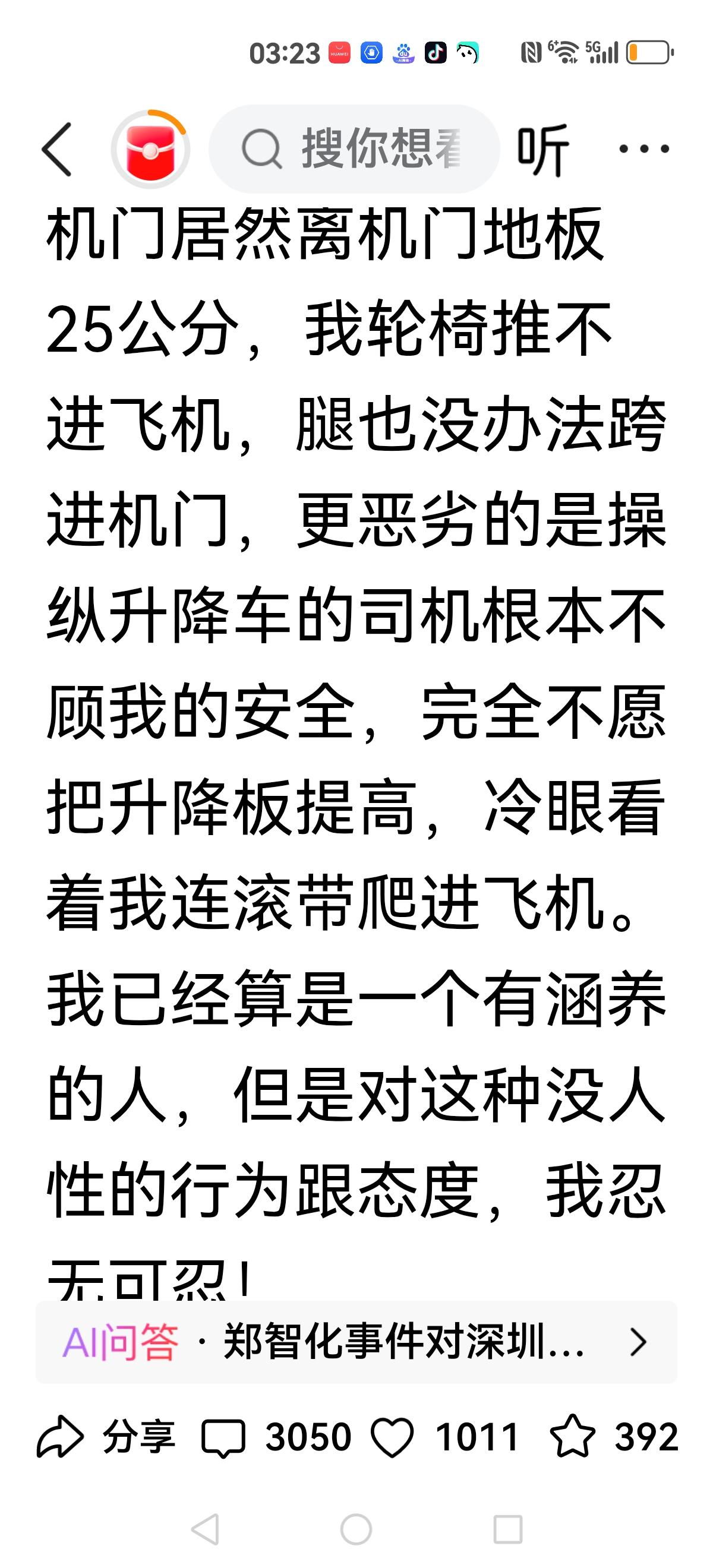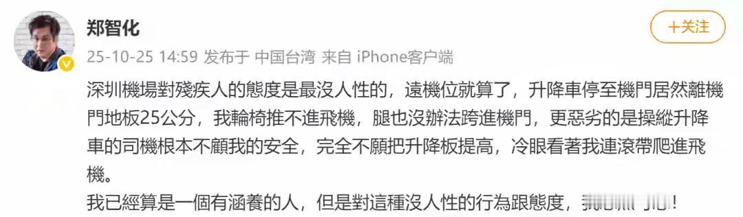 【有人还在说郑智化】 “忘恩负义”吗? 歌手李琛(窗外的原唱)也遇到同样的事情,看来绝不是郑智化的无理取闹,而是飞机舱门确实没有考虑到残疾人的问题。 这绝不是小事,而是人性化的关键时刻,越是迈向现代化城市,越是重视百姓的各种服务,人性化的服务,以及小民尊严。 尤其弱势群体,一个社会的进步,就是看对弱势群体的服务,做到细微之处,我们感谢郑智化吐槽,让我们清醒认知到服务的不周到之处,绝不是还在反噬人家,认为豆腐里挑骨头。