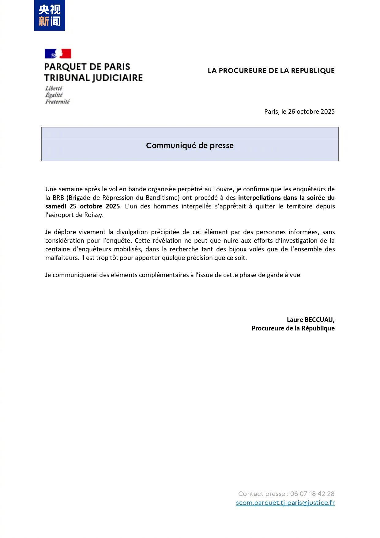 【#法国检方确认卢浮宫抢劫案嫌疑人被捕#】当地时间26日,巴黎检方发表声明,确认卢浮宫抢劫案已有嫌疑人被捕。