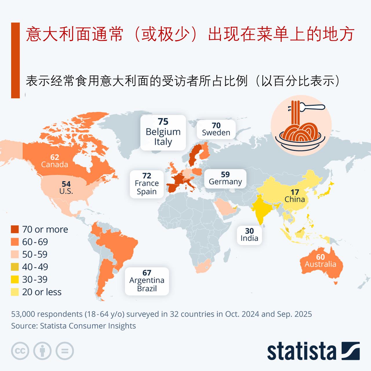 你能想到意大利面有这么普及吗? 据 Statista 消费者洞察数据统计,美国有 54%的受访者表示会经常食用意大利面。但与意大利这个意大利面的发源地相比,这一比例简直微不足道。在意大利,有 75%的人经常将意大利面纳入他们的饮食菜单。这种主食在比利时、法国和西班牙同样受欢迎,这些国家的受访者中,有 72%至 75%的人将其列为购物清单上的常备食品。 正如下面的地图所显示的那样,在那些传统上以大米作为大部分饮食主食的国家,比如印度、日本或中国,他们在饮食结构中补充类似意大利面这类食物的变化范围似乎较大。在印度,有 30%的受访者表示他们经常食用意大利面,而在中国,这一比例则降至仅 17%。 然而,中国这一较低的比例仍需要进一步解释,因为中国有着数千年面条的传统,有各种面条美食,面条主食很普遍。实际上,这份调查问卷只提及了意大利面,而没有特别提到亚洲面条,这可能会导致该地区受访者回答存在偏差。
