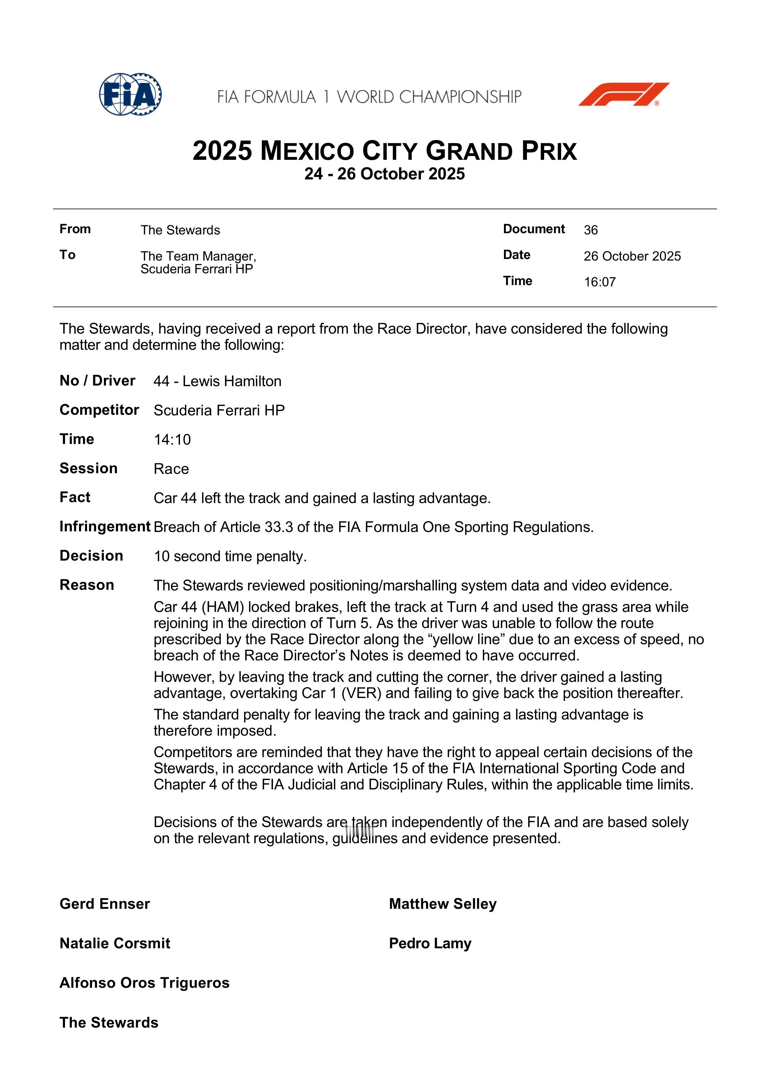 汉密尔顿在F1墨西哥站正赛中涉及的三张调查单及其判罚与理由1.离开赛道获得优势