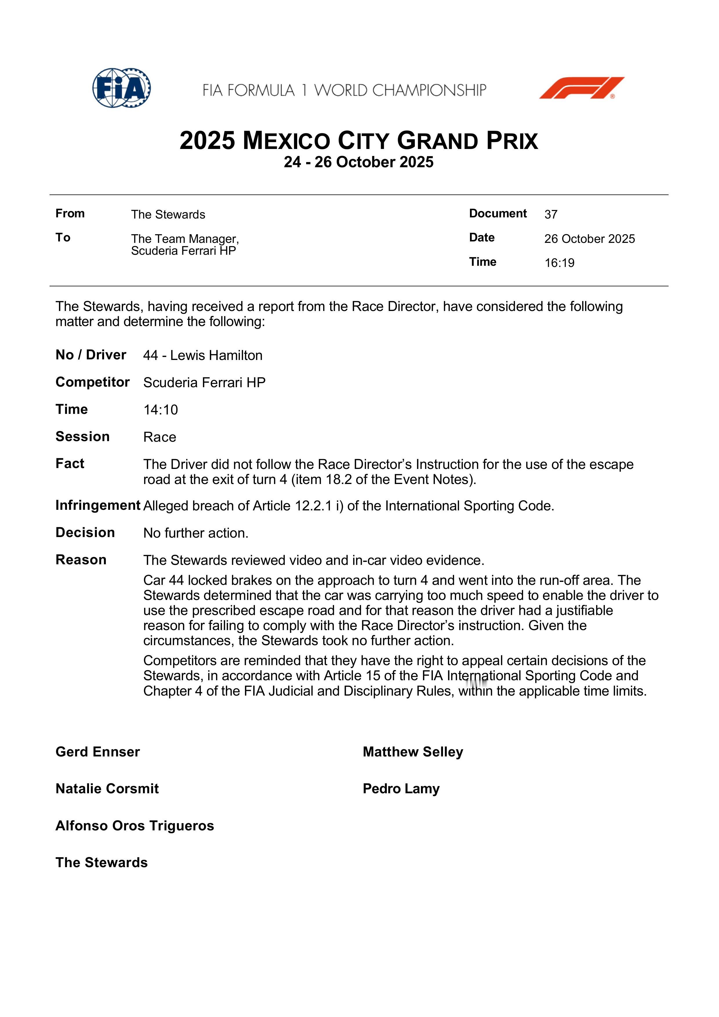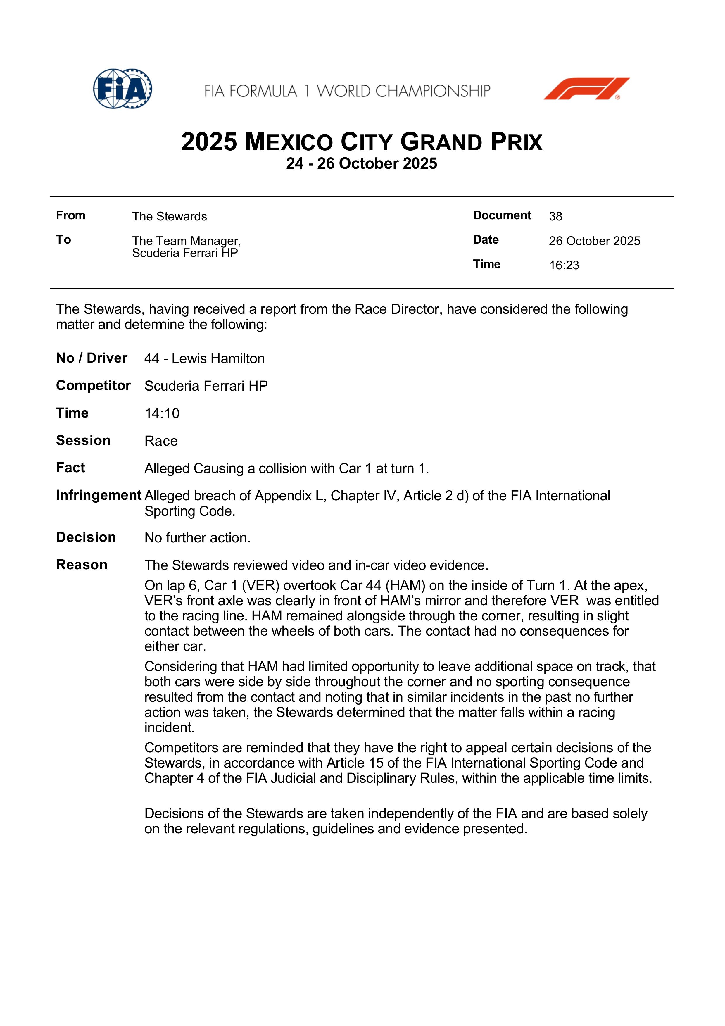 考虑到汉密尔顿在赛道上缺乏机会去留下额外空间,两车在整个弯角中始终保持并排,且接触未产生任何赛事后果,同时注意到过往类似事件均未采取进一步处理,赛事仲裁判定此事属于比赛事故。