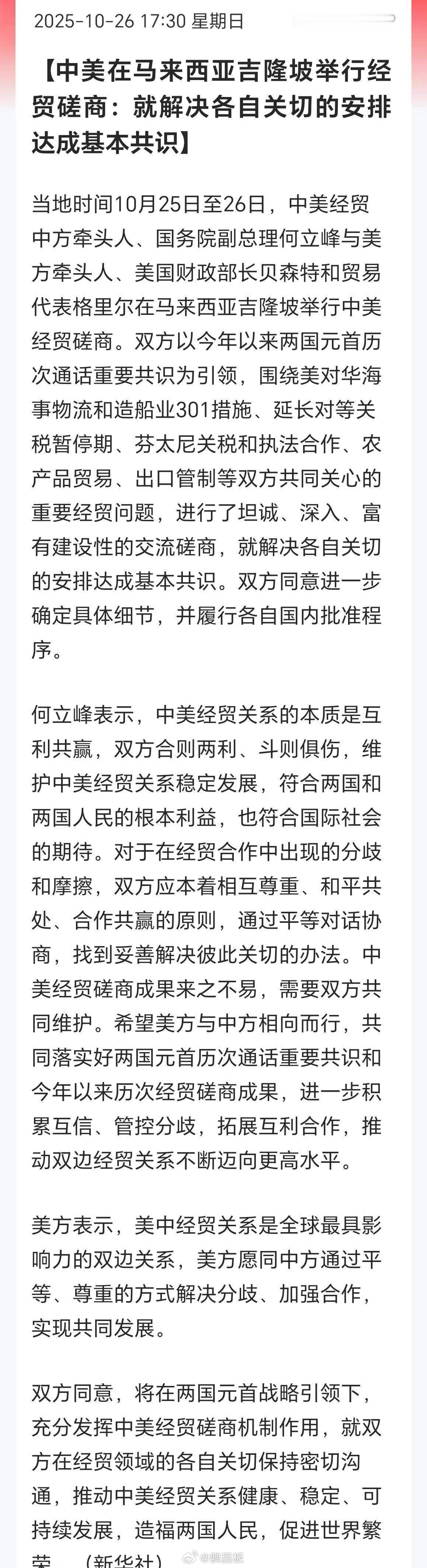 从已经披露的信息看,美方更乐观一些,我们更谨慎一些。不过总体上是偏积极的,1、虽无“一锤定音”的成果,但已经达成了一部分共识;2、中美持续“保持沟通”,这为APEC峰会会晤创造了一个良好的氛围。