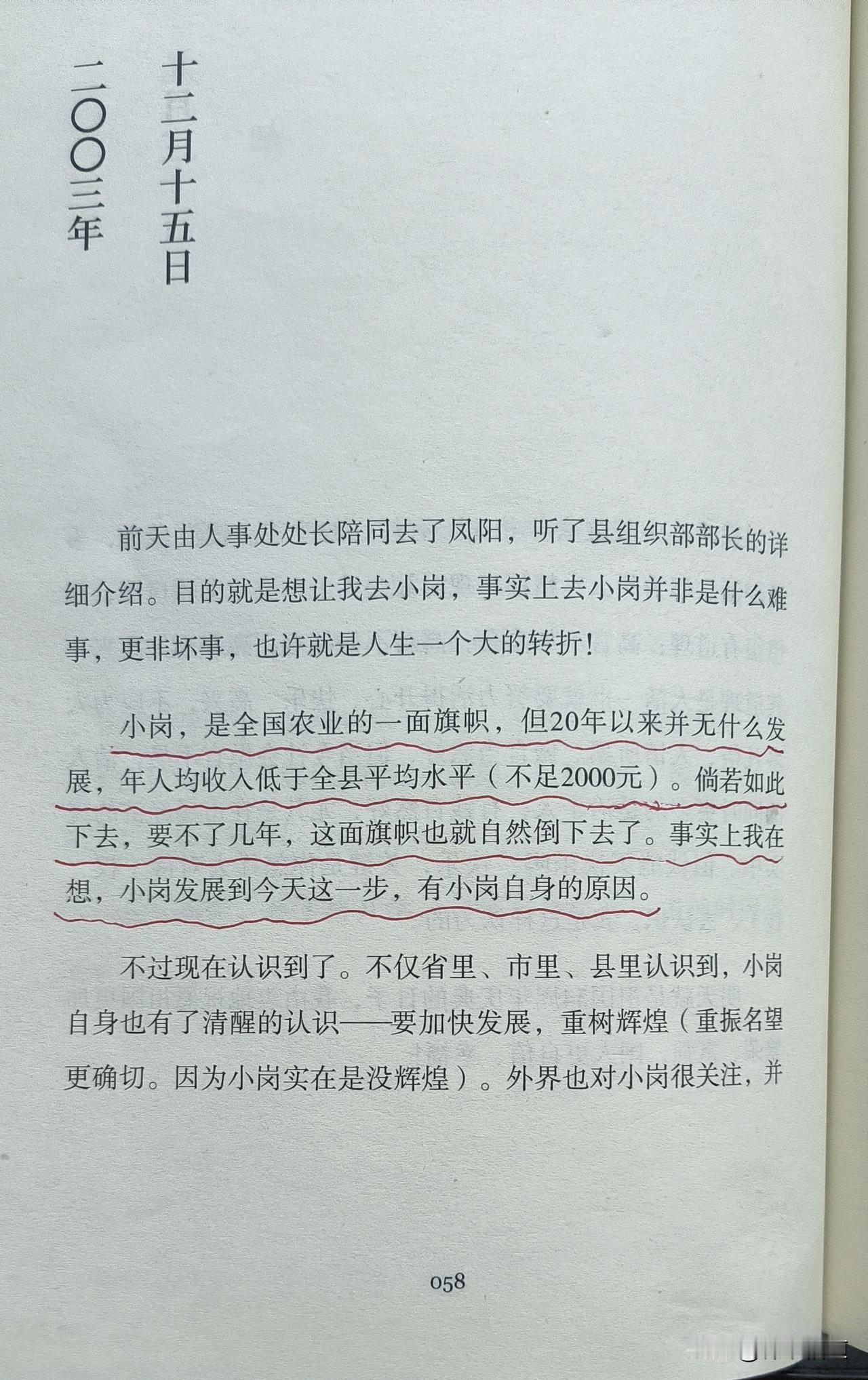 从朋友处,得到了一本《沈浩日记》,读《沈浩日记》,可以了解到小岗村当年的很多情况。 到小岗村任职书记的沈浩,绝对是个忠厚正直的好人,他写的日记,就是了解当年小岗村的第一手材料。 当年小岗村“一夜越过温饱线,二十年过不了富裕坎”,一夜越过温饱线,似有夸张的嫌疑,二十年过不了富裕坎,却是真实的存在。想不到大名鼎鼎的小岗村,名头起来后,年人均收入还达不到县的平均水平。
