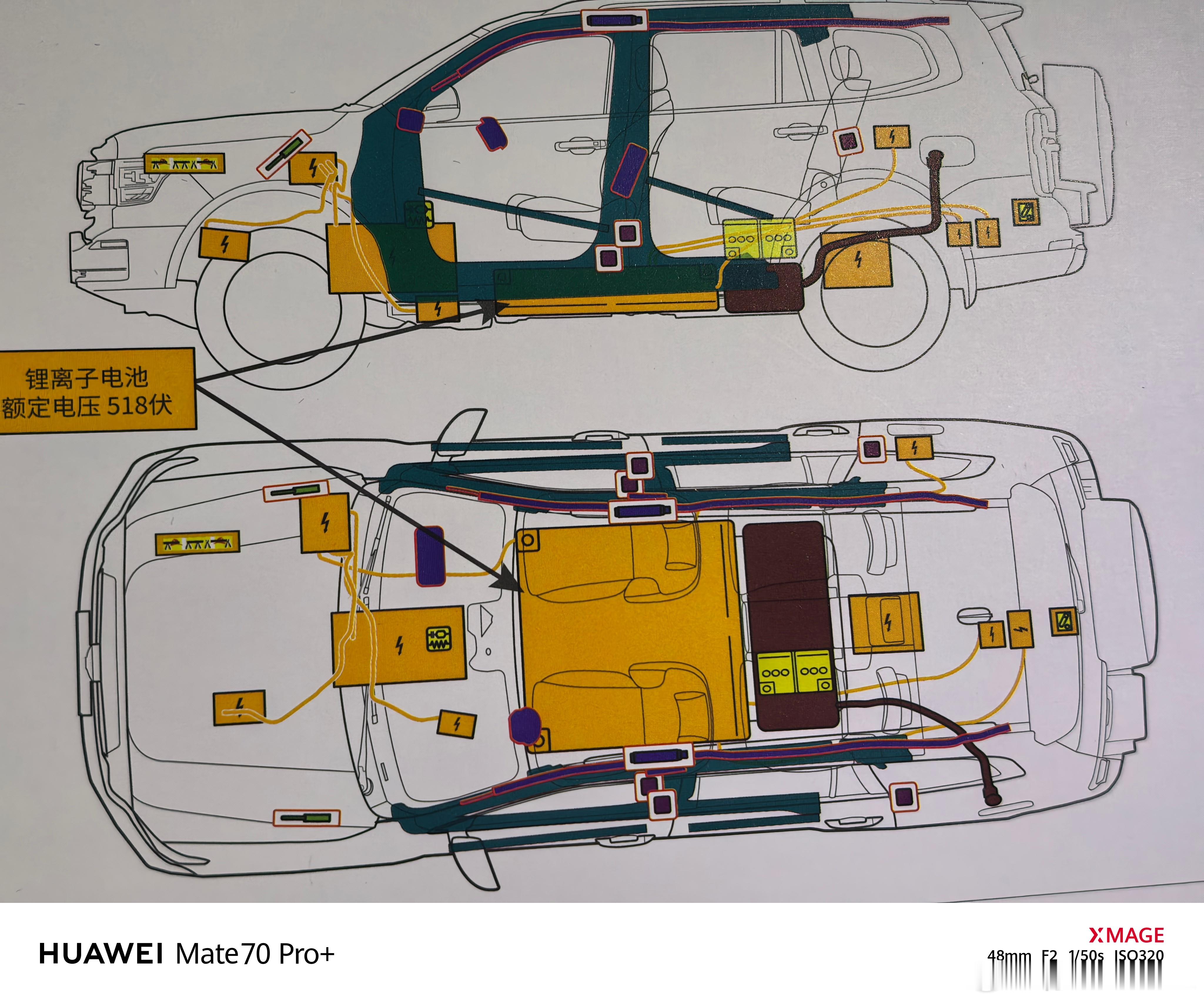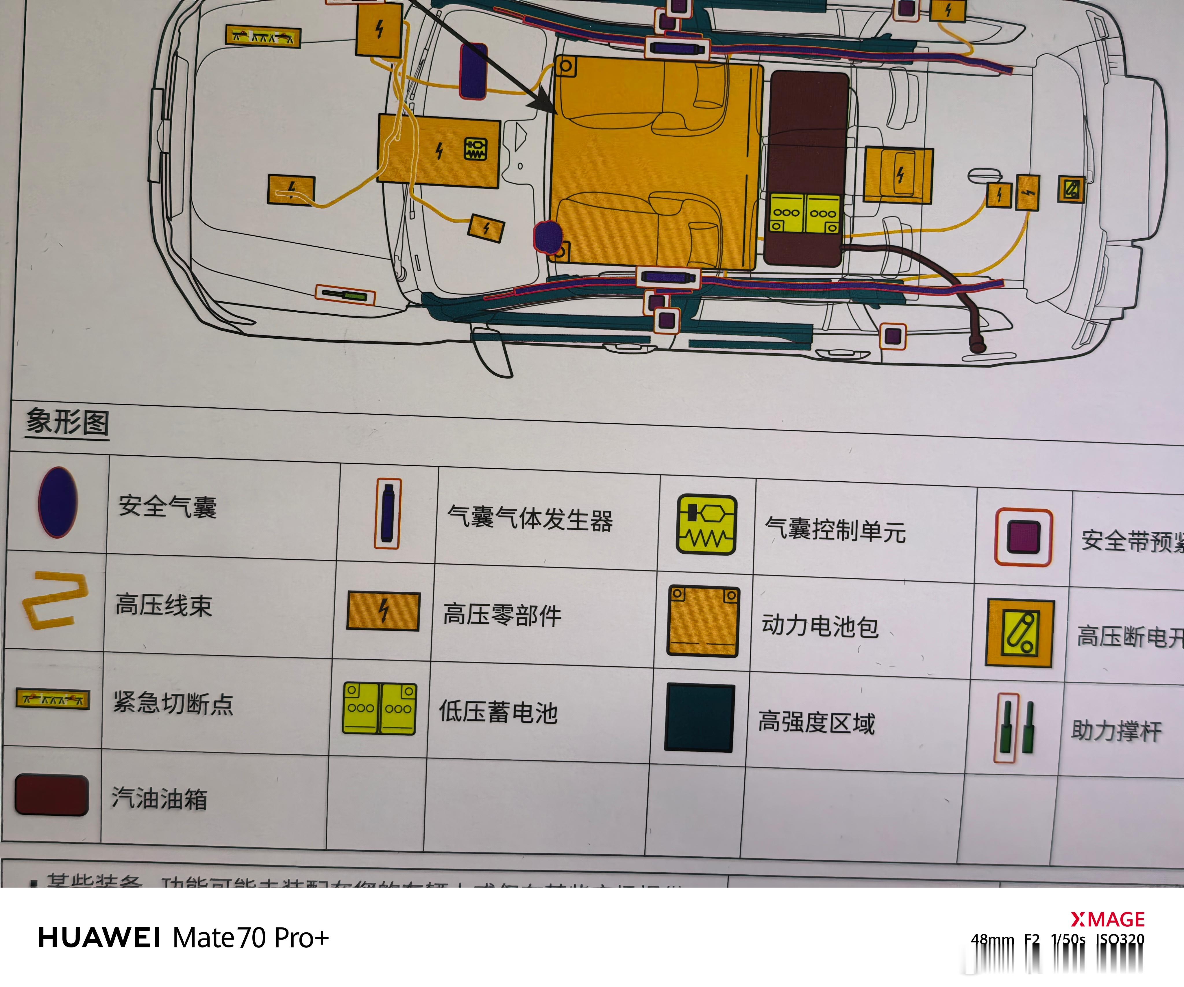 上面非常精确的标识了包括安全气囊、高压线束、高压零部件、电池包、油箱、高压断电开关、高强度钢等等在内的各个主要零部件所在位置。