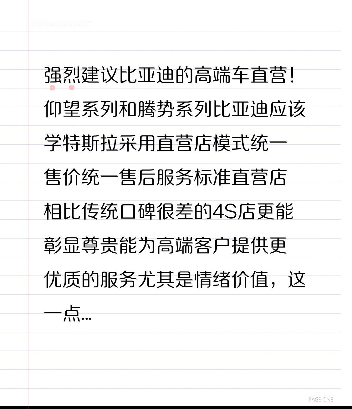 强烈建议比亚迪对高端车采用直营模式! 对于仰望系列和腾势系列,比亚迪应借鉴特斯拉,采用直营店模式。 实行统一售价,统一售后服务标准。 相较于口碑欠佳的传统4S店,直营店更能彰显尊贵,能为高端客户提供更优质的服务,尤其是情绪价值,这一点十分重要。@比亚迪