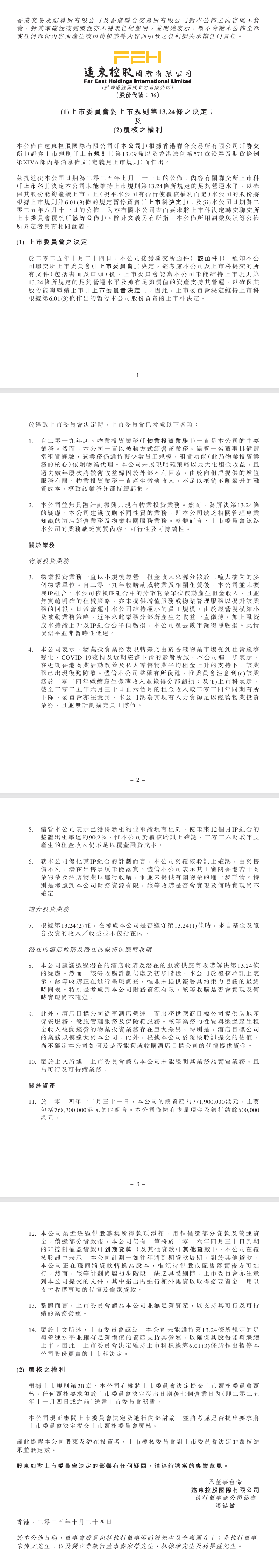 香港联交所(相当于香港的“证监会+交易所”)认为“远东控股国际有限公司”这家公司(股票代码0036)已经不行了,不符合继续上市的标准,所以要准备停牌(停止股票交易),甚至可能最终退市。